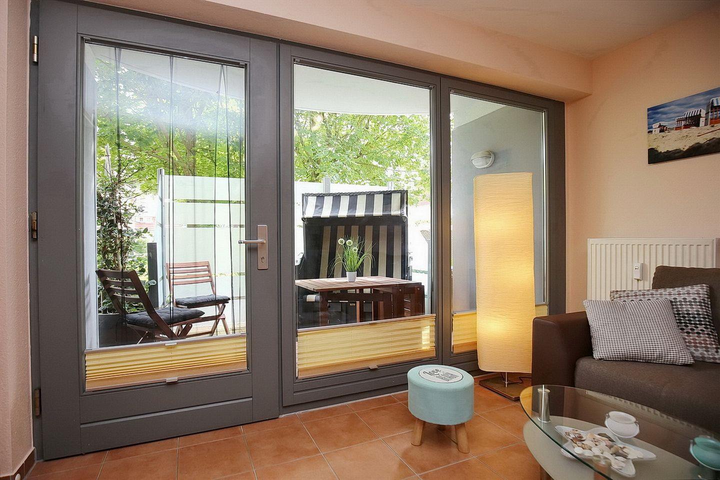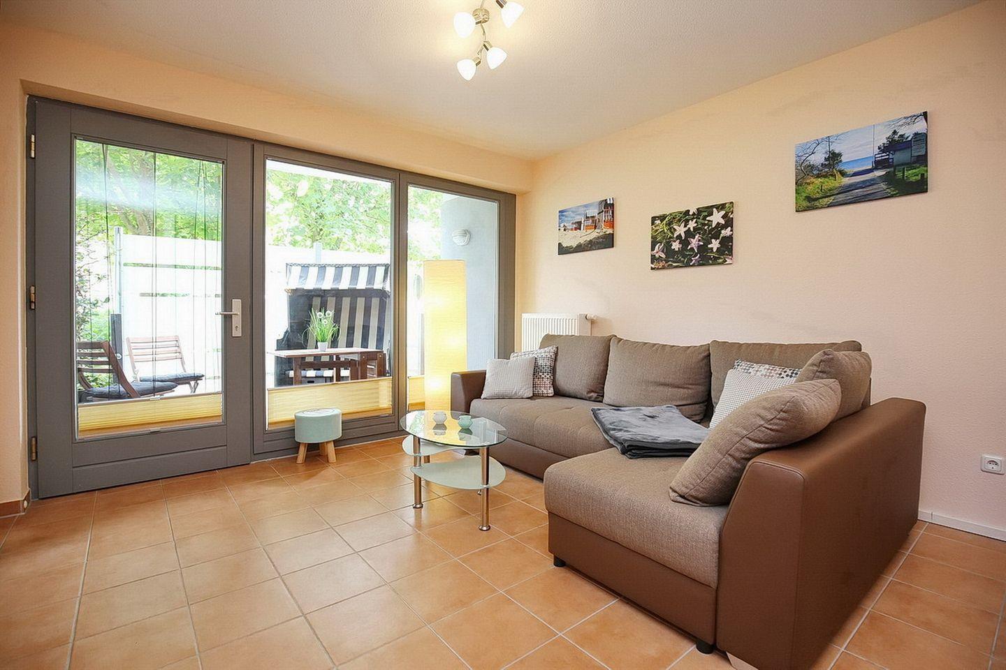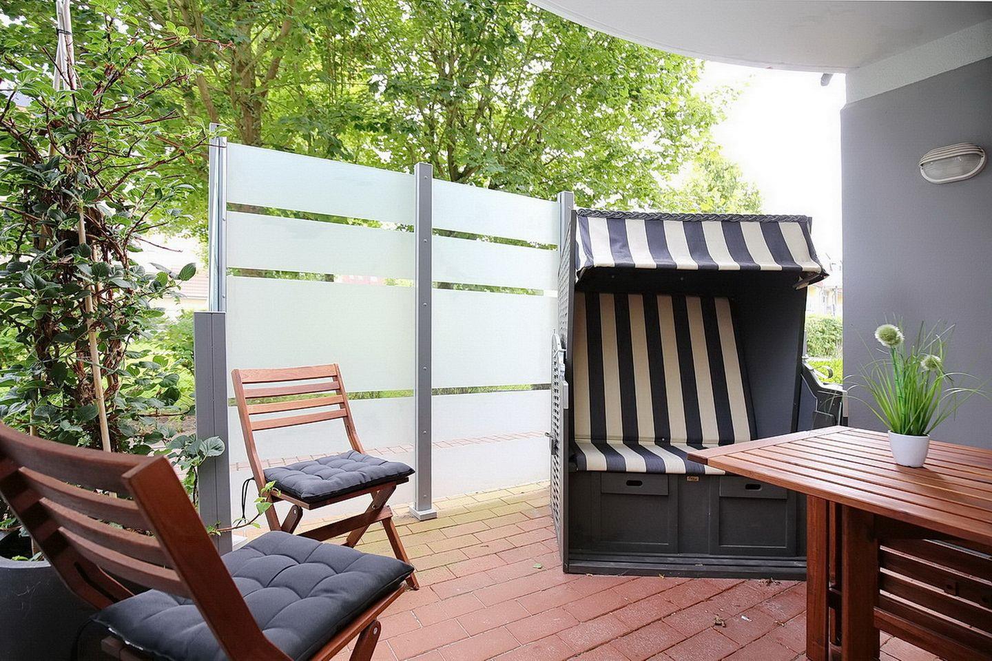 Im Wohnzimmer sorgen ein TV-Flatscreen mit integriertem Radio für deine Unterhaltung. Direkt vom Wohnzimmer gelangst du auf die in Süd-Ost Richtung gelegene möblierte Terrasse mit einem Strandkorb.