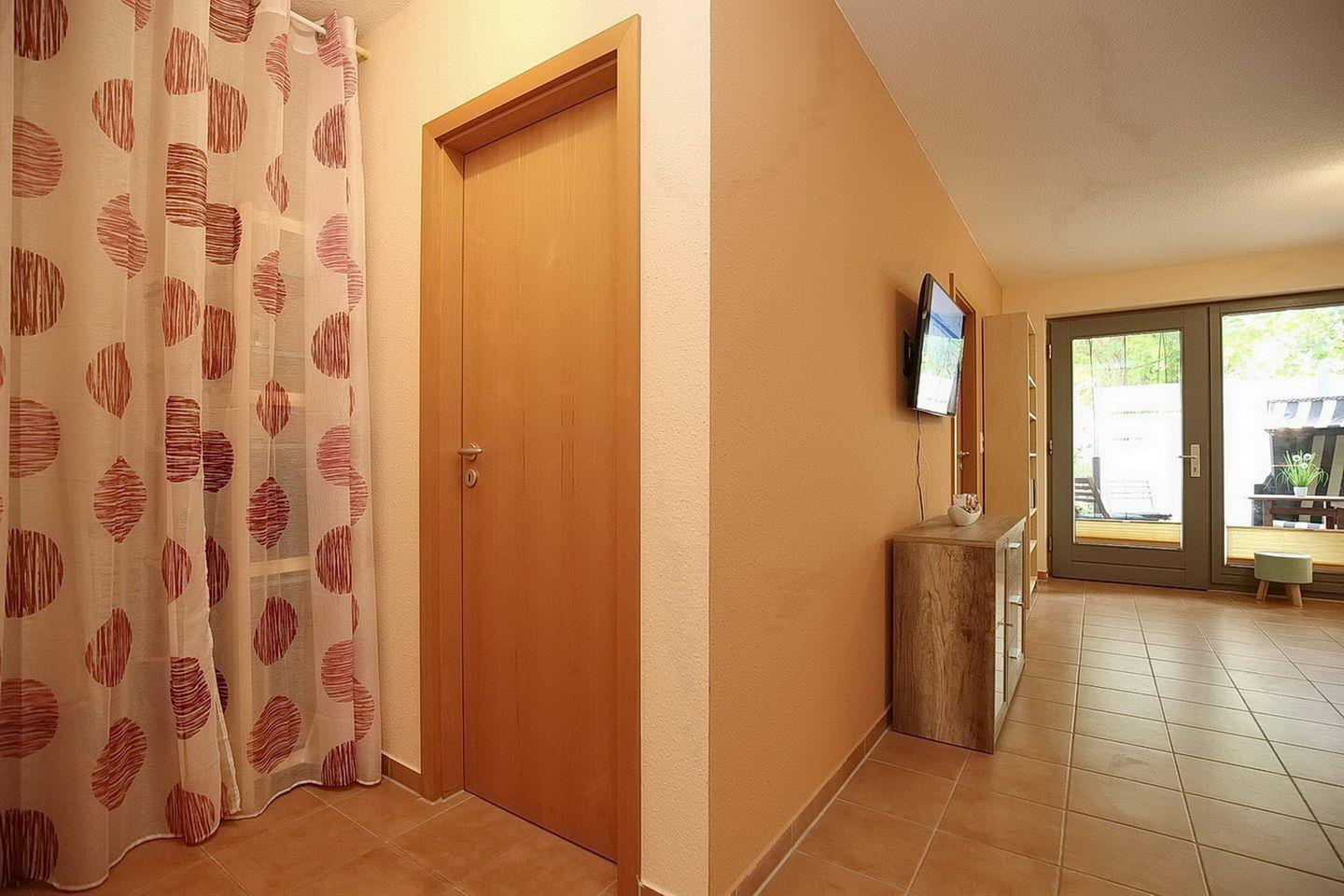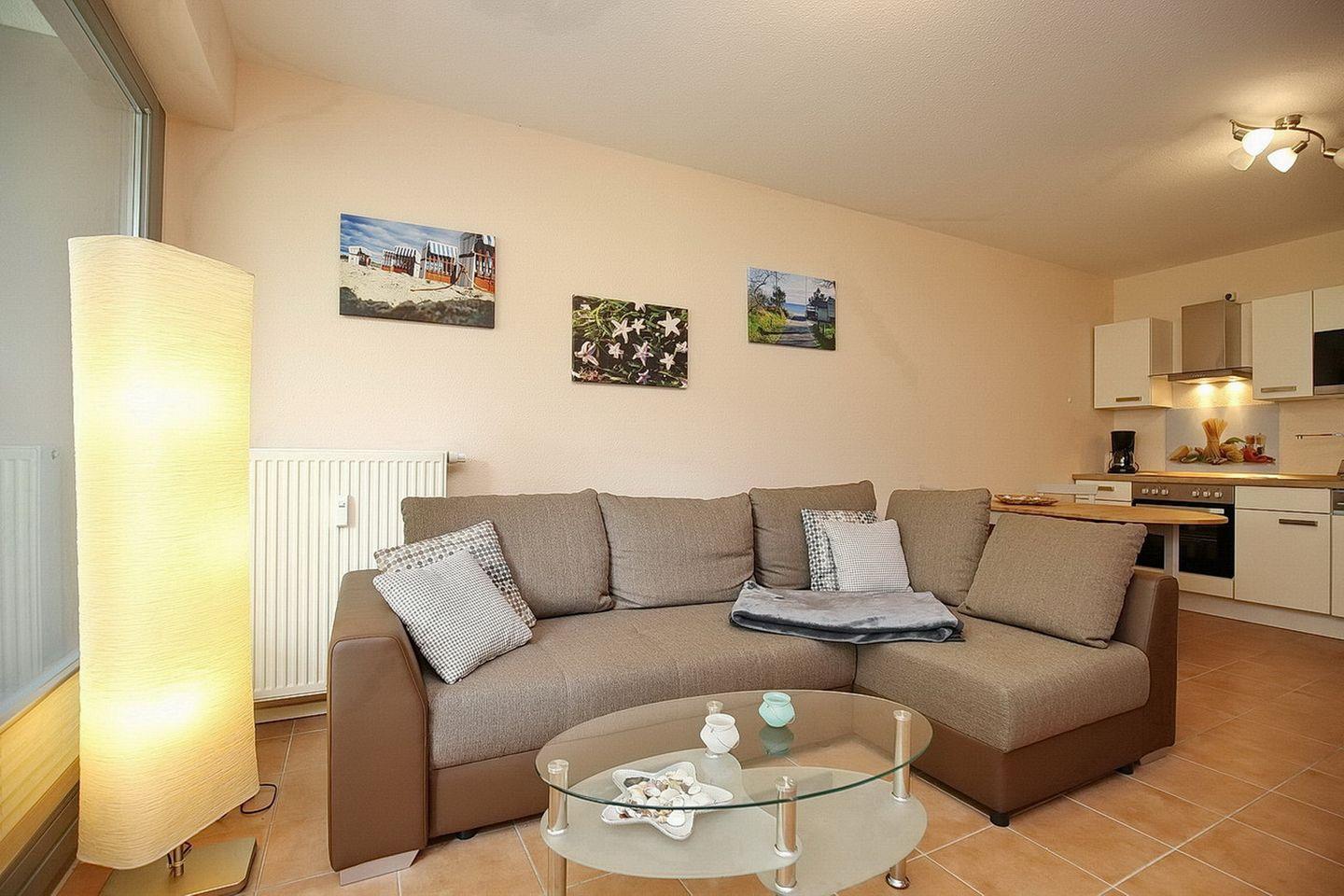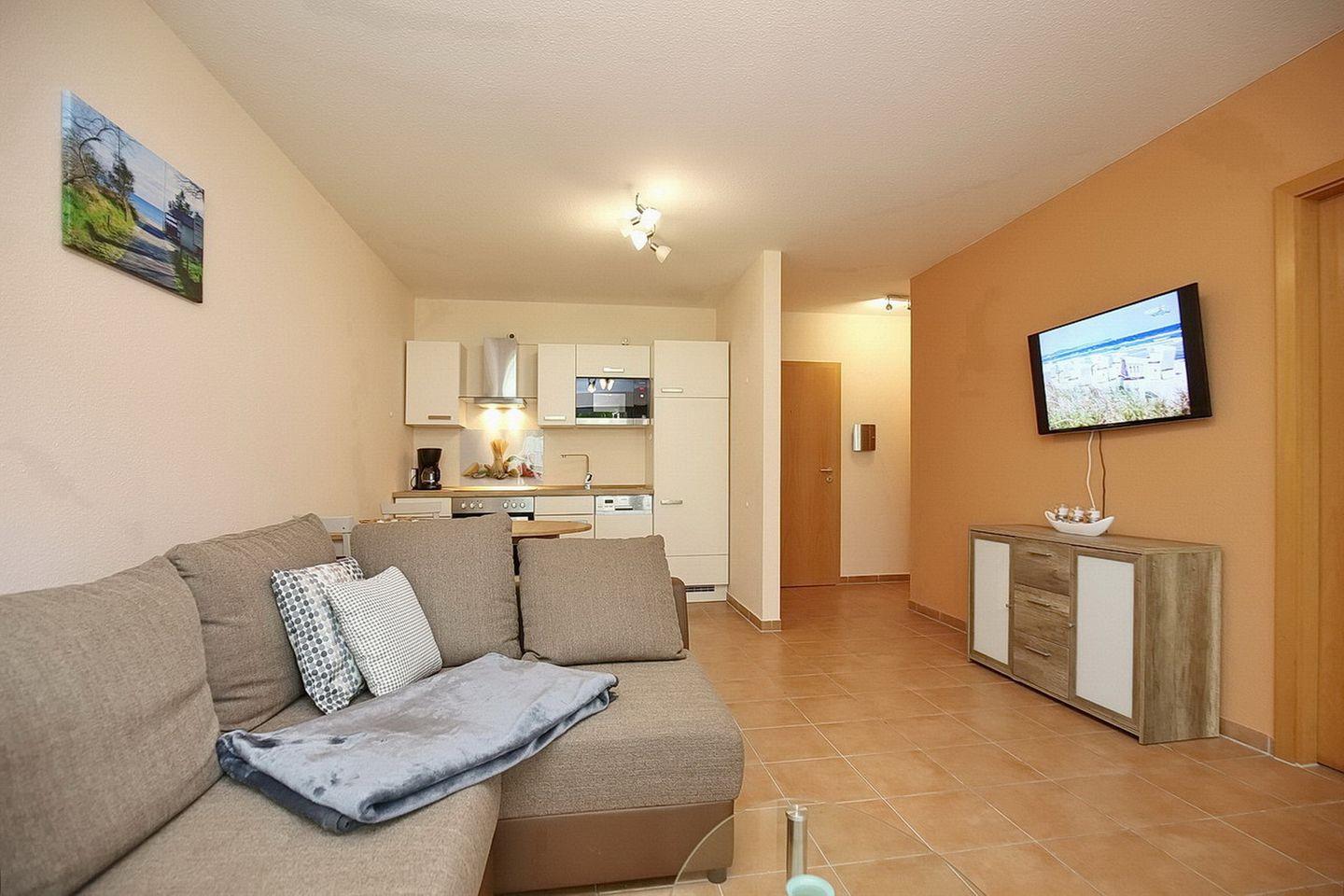 Im Wohnzimmer sorgen ein TV-Flatscreen mit integriertem Radio für deine Unterhaltung. Direkt vom Wohnzimmer gelangst du auf die in Süd-Ost Richtung gelegene möblierte Terrasse mit einem Strandkorb.