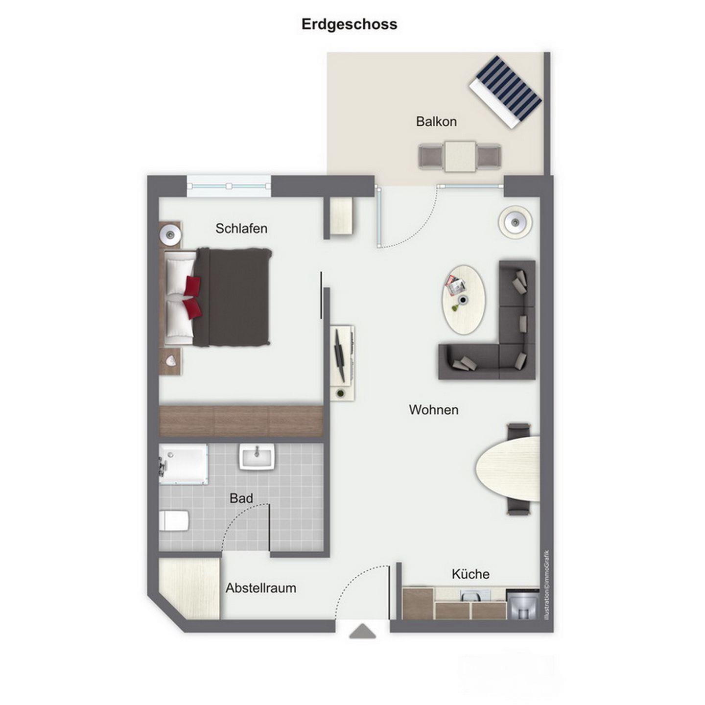 Die ca. 43 m² große 2-Zimmer-Wohnung mit Terrasse befindet sich im Erdgeschoss. Dir stehen ein Wohnzimmer mit Küchenzeile, ein Schlafzimmer sowie ein Badezimmer zur Verfügung. Es sind nur 60 m zum Strand.