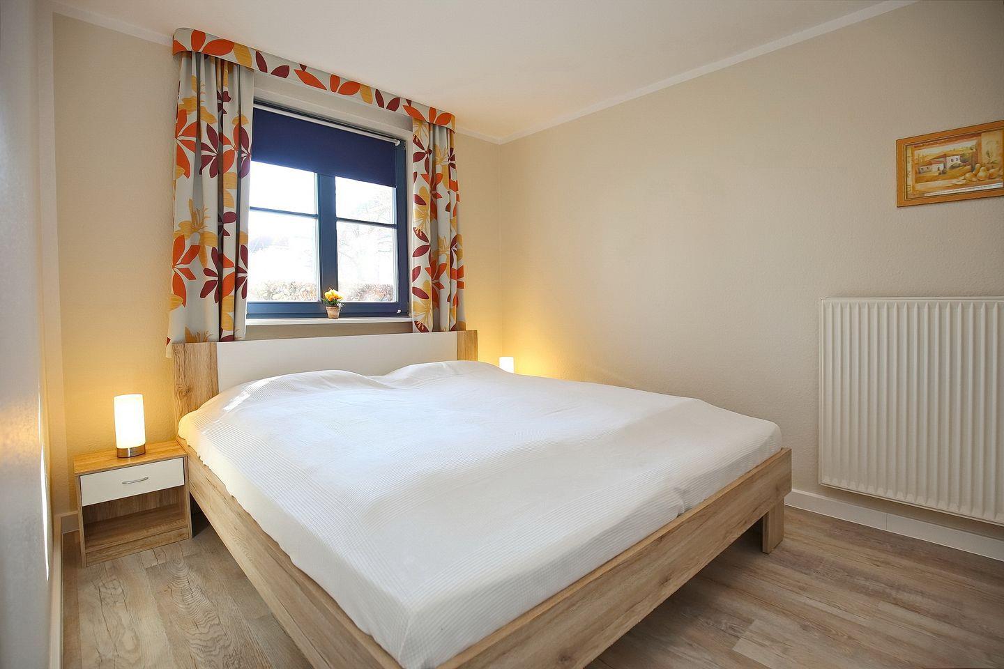 Das Schlafzimmer hat ein Doppelbett mit zwei Einzelmatratzen (90 x 200 cm) und einen geräumigen Kleiderschrank. Ein weiterer Kleiderschrank befindet sich im Eingangsbereich. Zur Verdunklung an den Fenstern dient im Schlafraum ein Rollo.