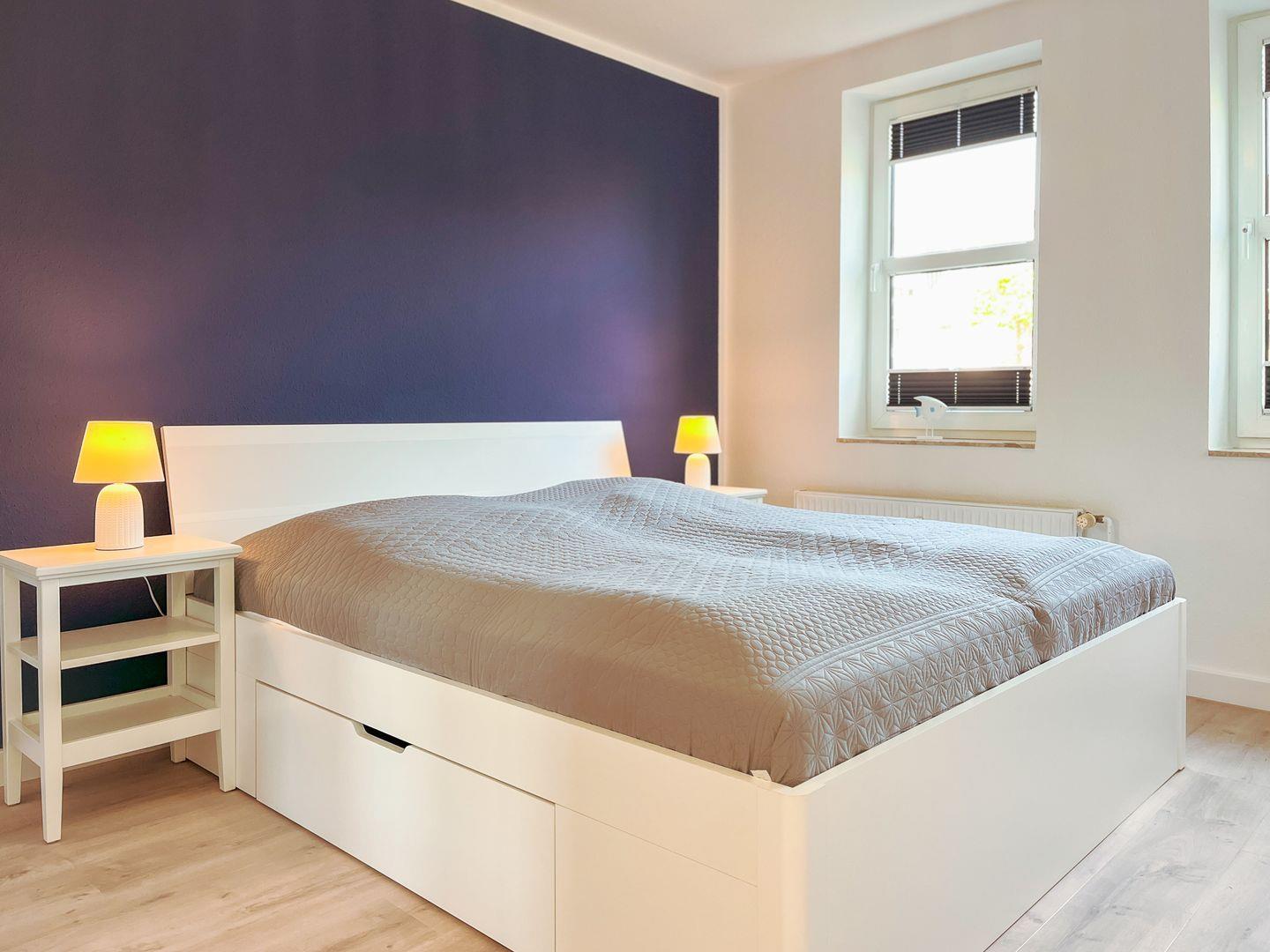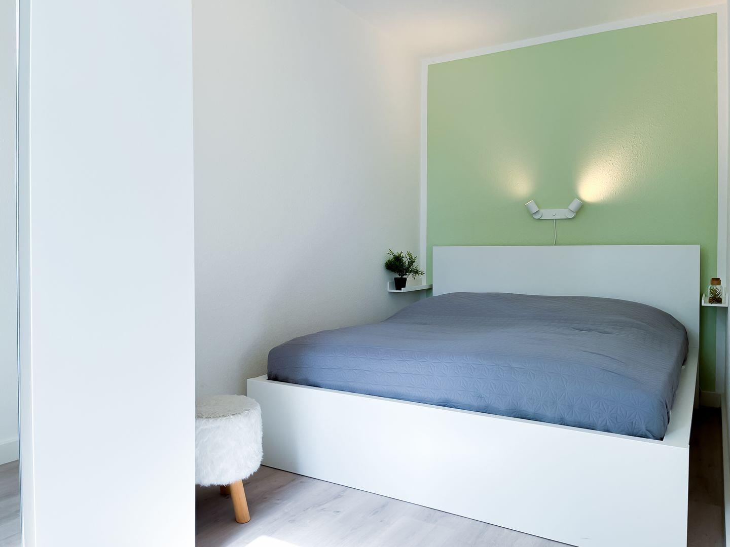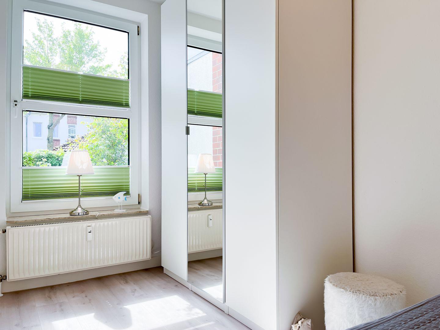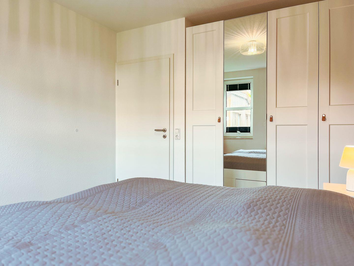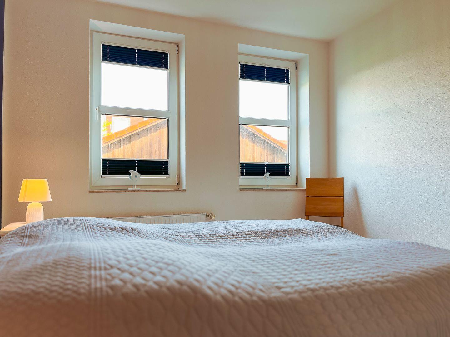Die Schlafzimmer sind jeweils mit einem Doppelbett (2 x 80 x 200 cm und 2 x 90 x 200 cm) und einem Kleiderschrank ausgestattet. Zur Abdunkelung an den Fenstern dienen Rollos und Vorhänge. Als Bodenbelag wurde in den Schlafräumen Teppich gewählt.