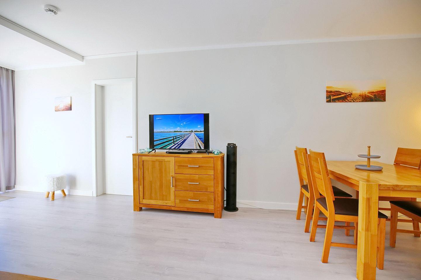 Auf die möblierte Terrasse gelangst du vom Wohnzimmer aus. Der Wohnbereich ist mit einer Eck-Couch und einem Essplatz für vier Personen eingerichtet. Dort könnt ihr in geselliger Runde die Mahlzeiten einnehmen. Für Kurzweil sorgen ein Flachbild-TV (Smart-TV), DVD-Player und eine Stereoanlage.