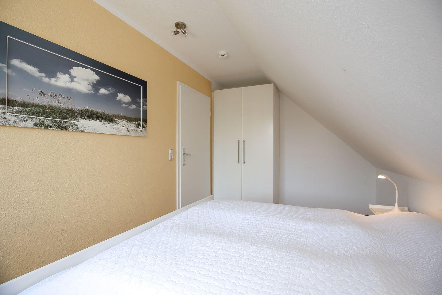 In den Schlafzimmern im Obergeschoss findest du je ein Doppelbett (2 x 90 x 200 cm und 160 x 200 cm) sowie einen Kleiderschrank vor. Beide Schlafzimmer sind mit einem Fliegengitter, sowie einer Verdunklungsmöglichkeit versehen. Das Schlafzimmer im Erdgeschoss ist mit einem Einzelbett (90 x 200 cm) ausgestattet.