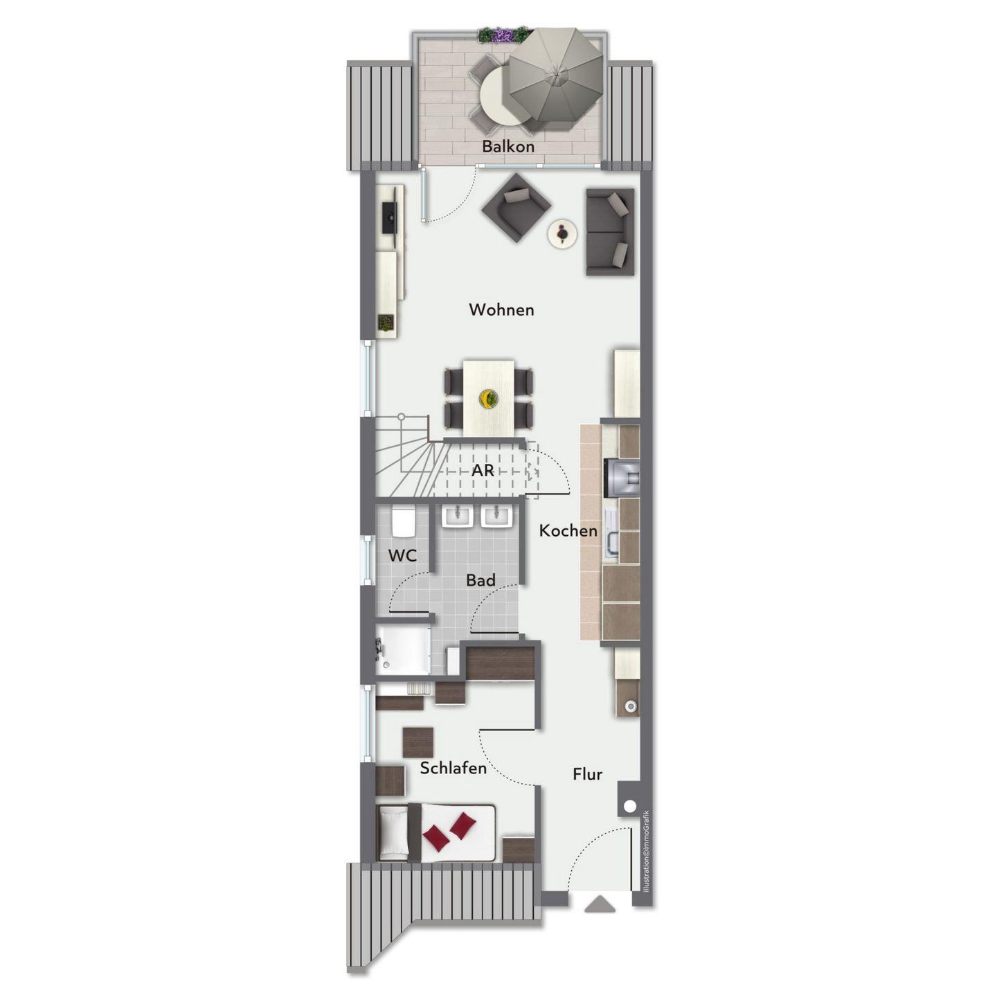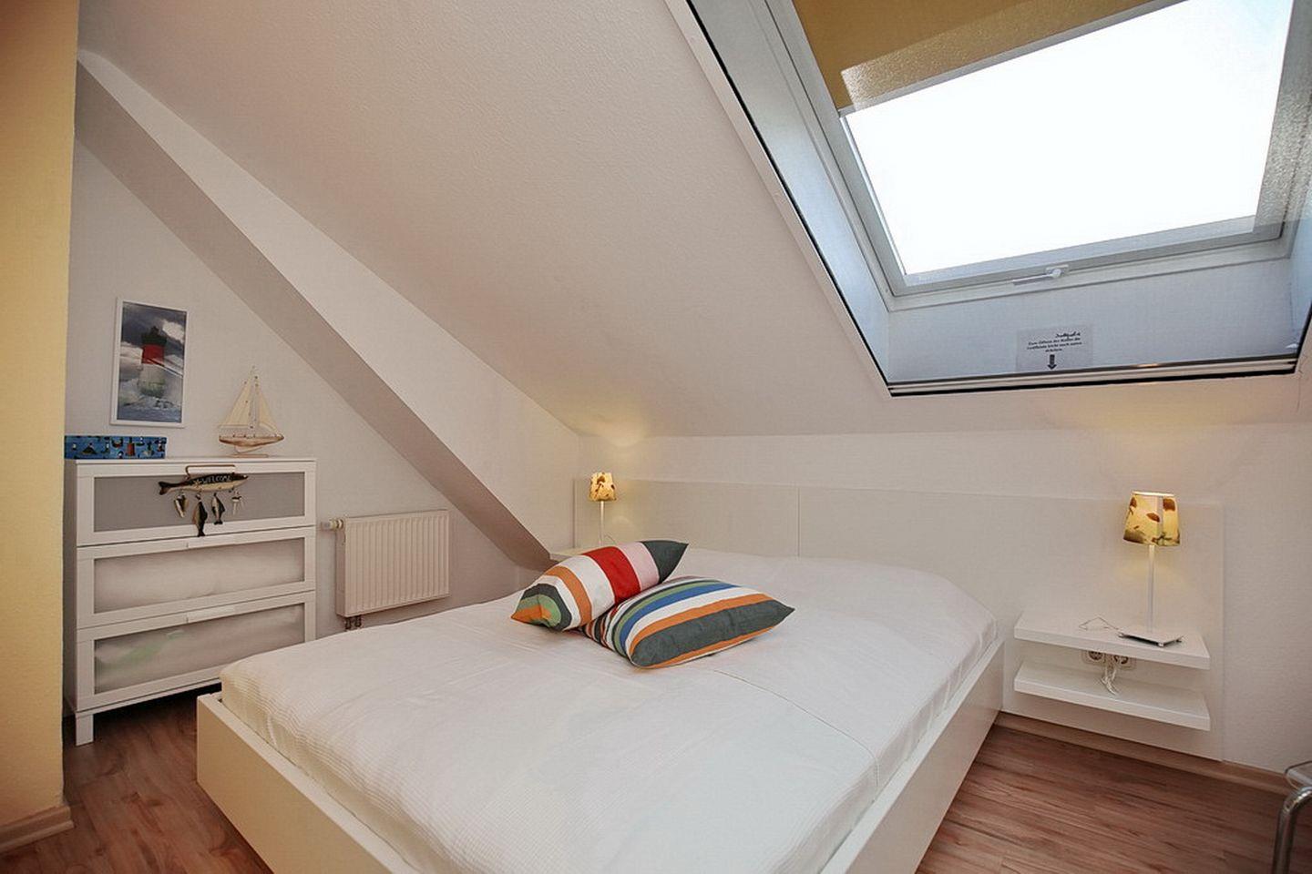 Den sonnigen Balkon erreichst du aus dem Wohnbereich. Der gemütliche Wohnraum ist mit einer Couch und einem Relax Sessel sowie dem Essbereich für 5 Personen eingerichtet. Zu deiner Unterhaltung findest du einen Flachbild TV, einen DVD-Player, eine Stereoanlage sowie eine große Auswahl an DVDs und CDs vor. Des Weiteren kannst du dich in die zahlreichen Bücher vertiefen. Über die innenliegende Treppe erreichst du die beiden Schlafzimmer im Dachgeschoss.