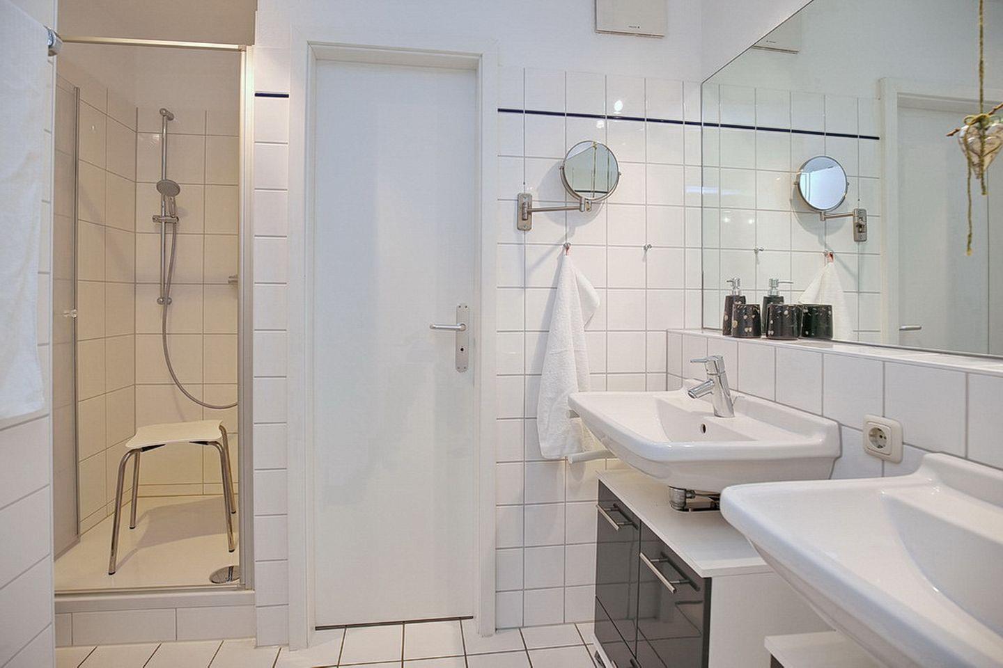 In dem geräumigen Duschbad mit zwei Waschbecken gibt es ein separates WC mit Fenster. In dieser Nichtraucherwohnung sind Haustiere nicht erlaubt.