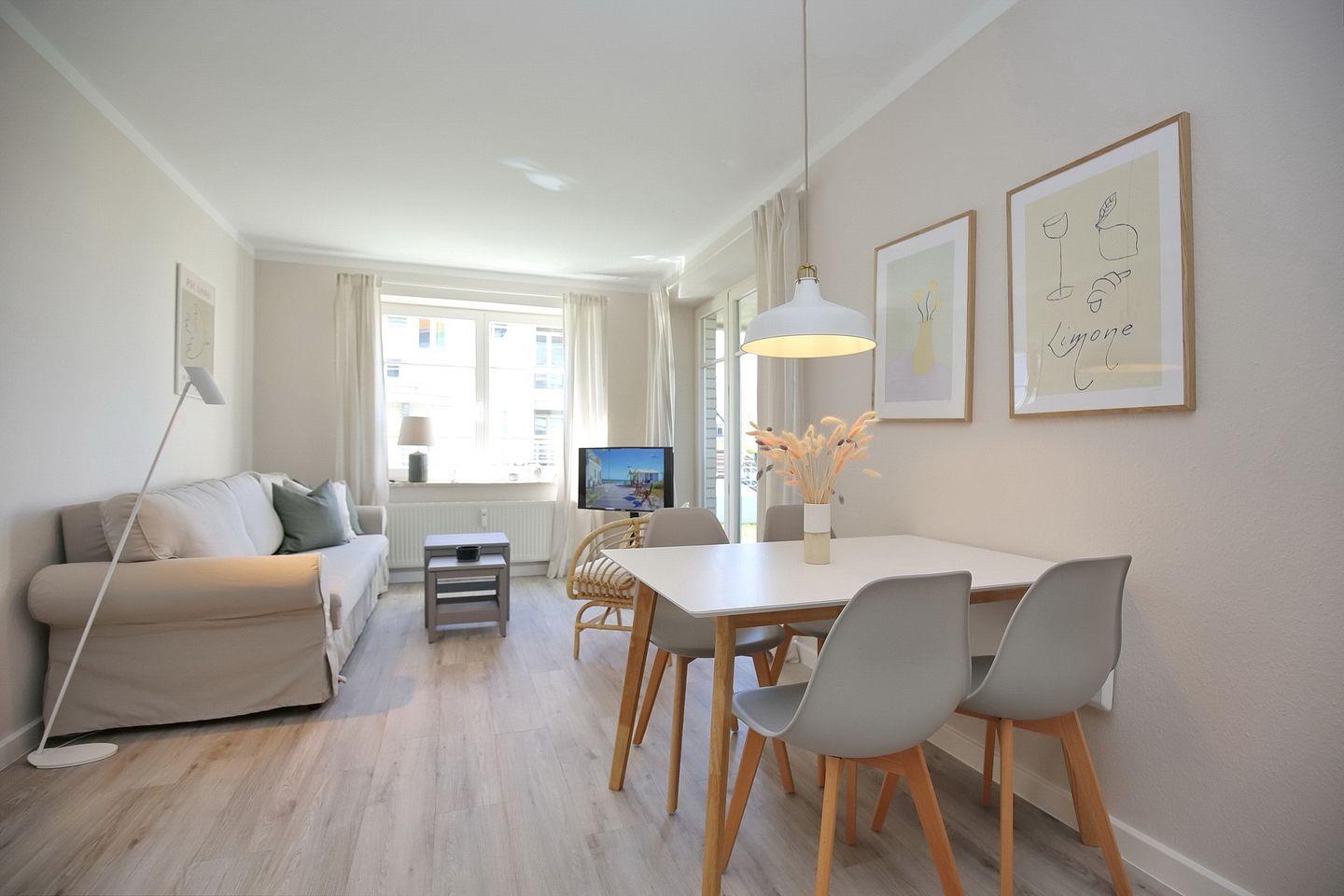 Die im skandinavischen Wohnstil eingerichtete Wohnung lädt dich mit den freundlichen Farben zum Entspannen und Genießen ein.