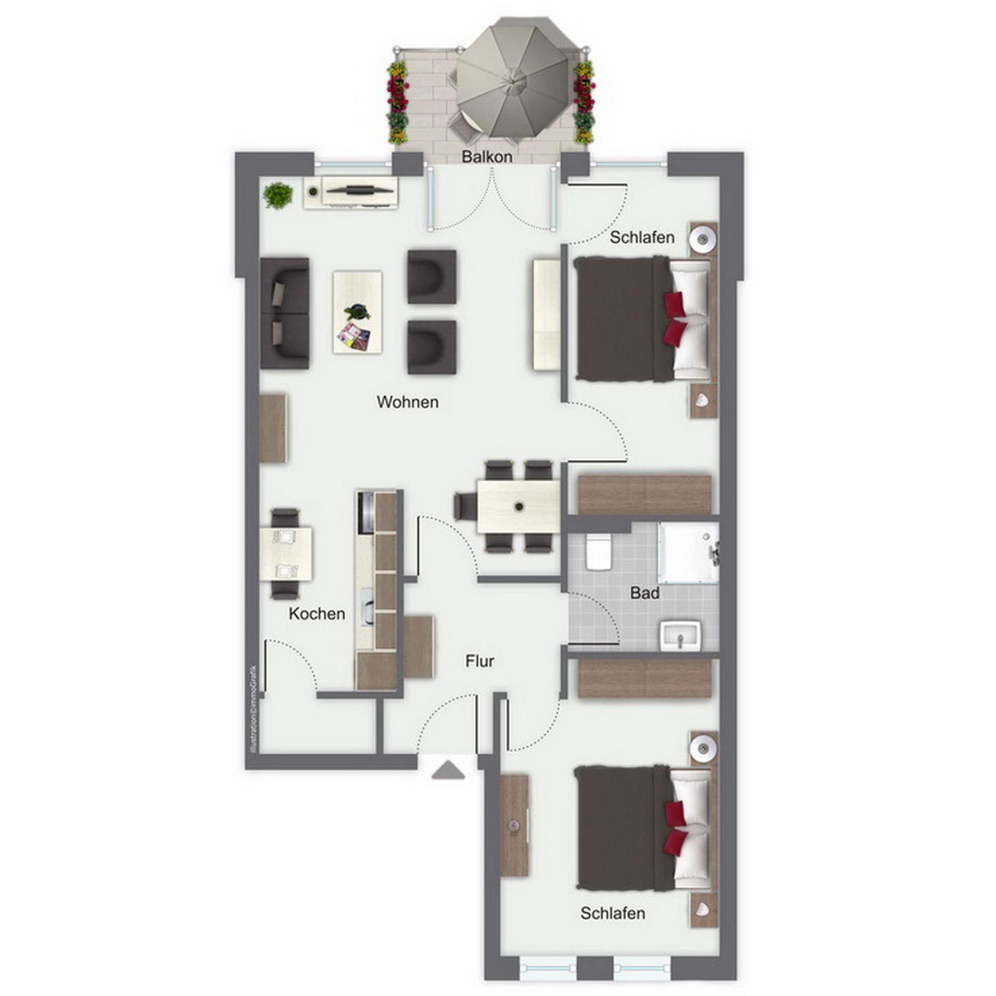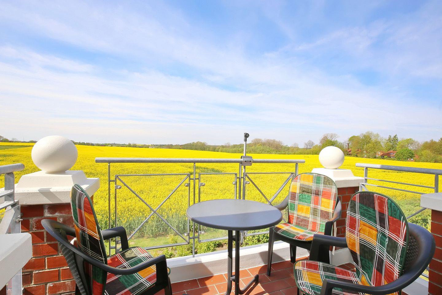 Genieße auf dem Balkon den schönen Ausblick in Richtung Klützer Mühle. Den möblierten Balkon betrittst du über das Wohnzimmer. Dir wird im Wohnbereich eine Couchgarnitur geboten. Für Kurzweil sorgen ein Flachbild-TV, eine Stereoanlage und ein CD-Player.