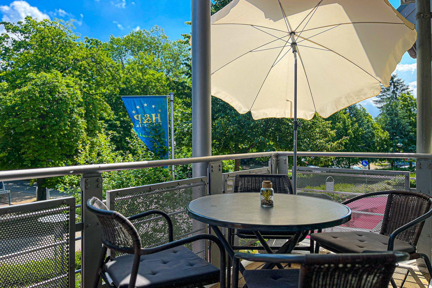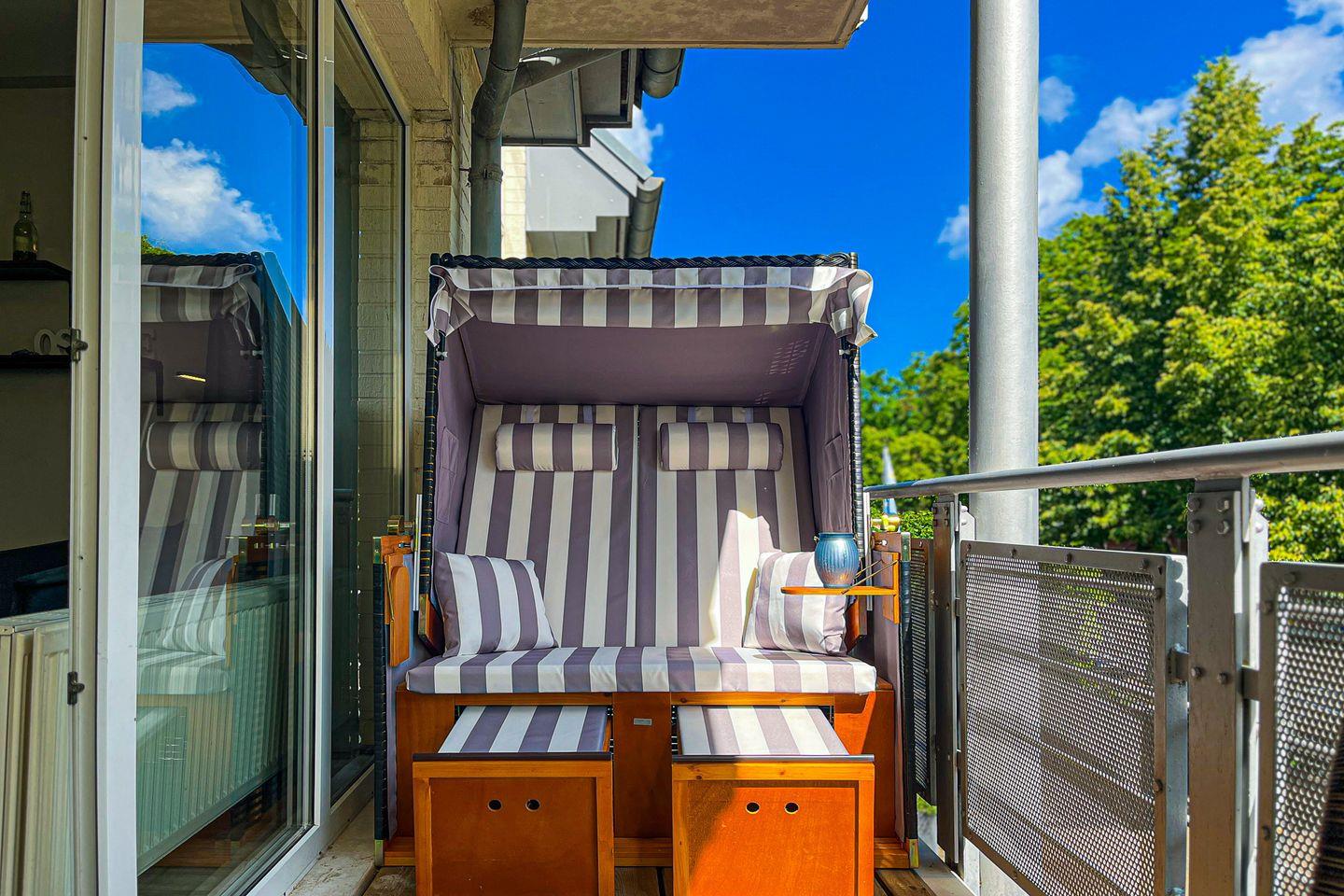 Im 1. Obergeschoss gelegen, ca. 60 m² groß, verfügst du über einen großen Balkon in Richtung Seeseite, ein Wohnzimmer mit Küchenzeile, ein Schlafzimmer sowie ein Duschbad. Zum Strand sind es nur ca. 100 m.