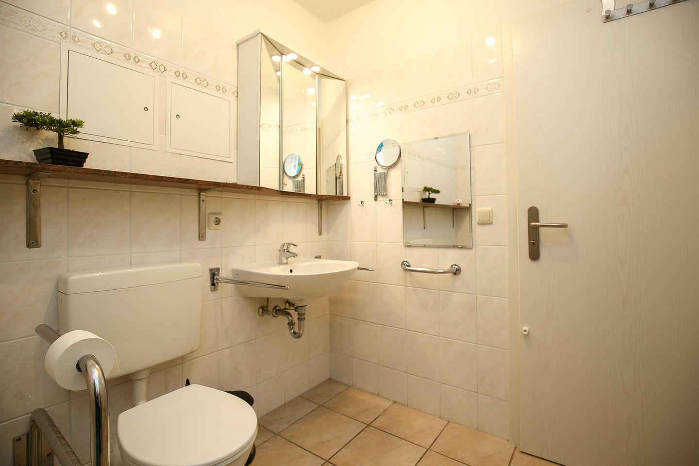 Das rollstuhlgerechte Bad ist mit einem WC, einem Bidet und einer befahrbaren Dusche ausgestattet.