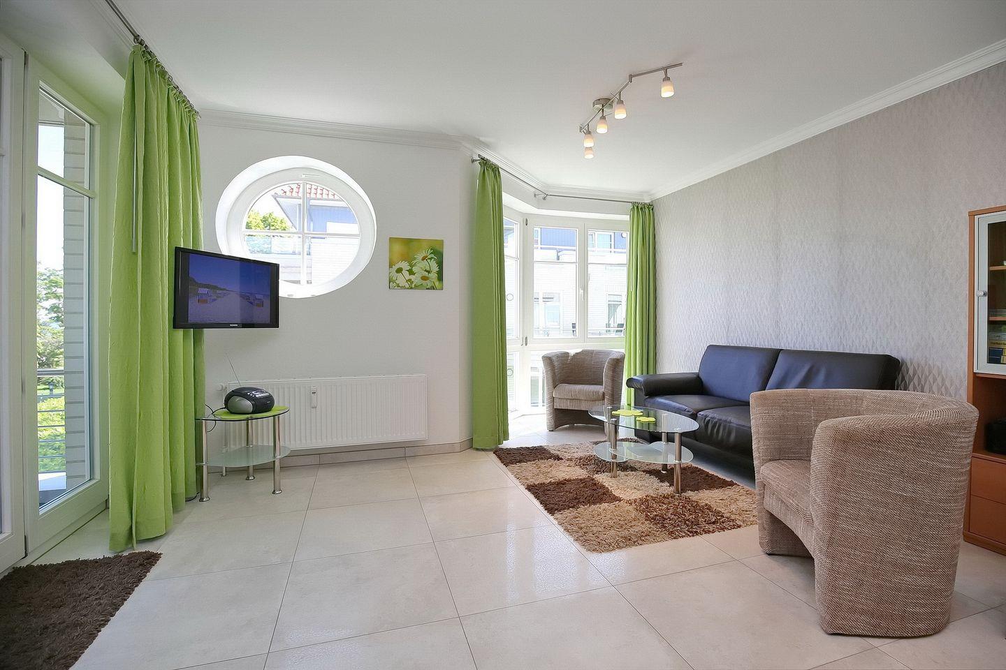 Genießen Sie vom möblierten Balkon schönen Stunden im Freien. Hier schließt sich der Wohnbereich mit moderner Couchgarnitur direkt an. Im Wohnzimmer sorgen ein Flachbild-TV, eine Stereoanlage und eine Auswahl an Spielen für Kurzweil.