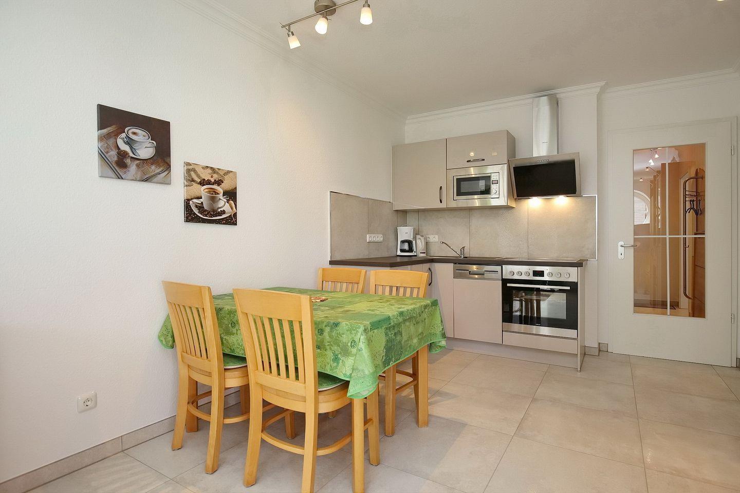 In unmittelbarer Nähe ist ebenfalls der Essbereich mit einer neuen Küchenzeile platziert. Diese ist mit einer Mikrowelle, einem Kühlschrank mit Gefrierfach, Geschirrspüler und einem 4-Platten-Cerankochfeld eingerichtet.