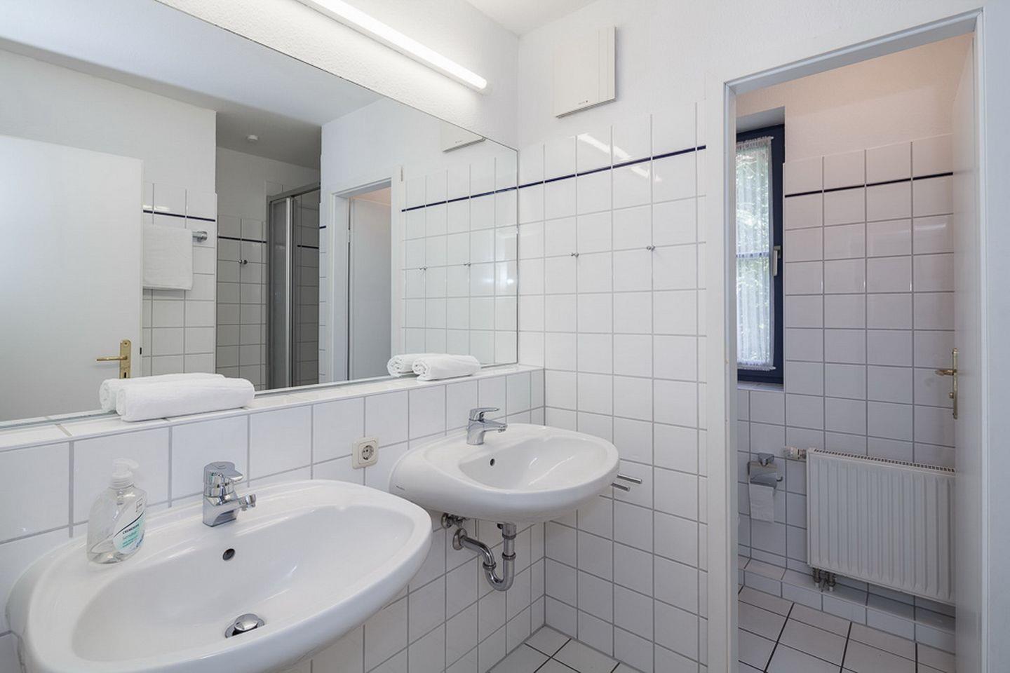 Im großen Duschbad mit zwei Waschbecken gibt es ein separates WC mit einem Fenster. Fahrräder können im Fahrradkeller des Hauses sicher abgestellt werden. Kleine Haustiere sind in der Nichtraucherwohnung erlaubt.