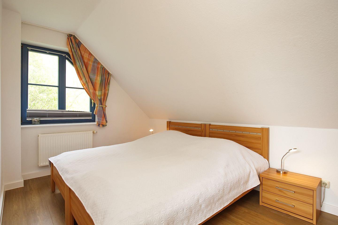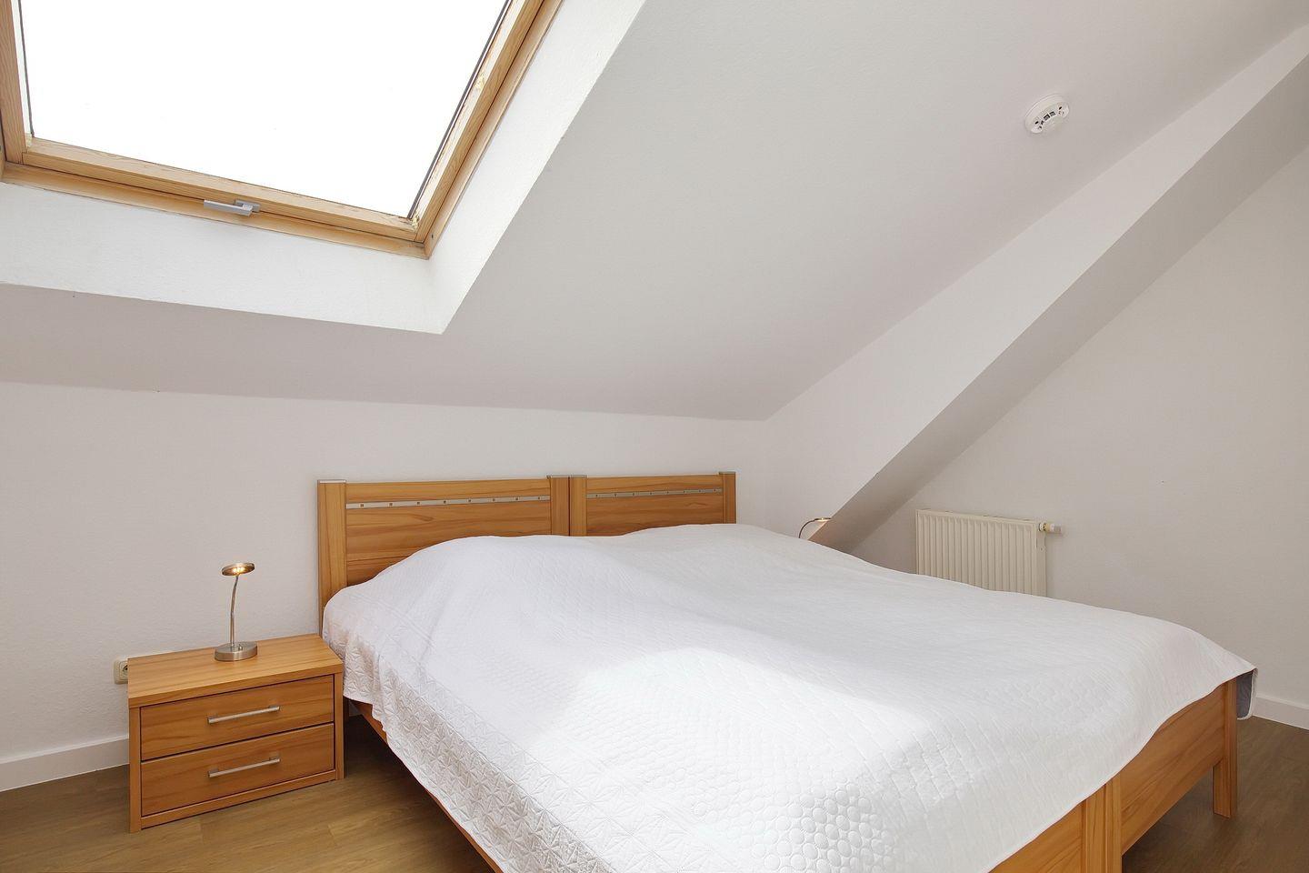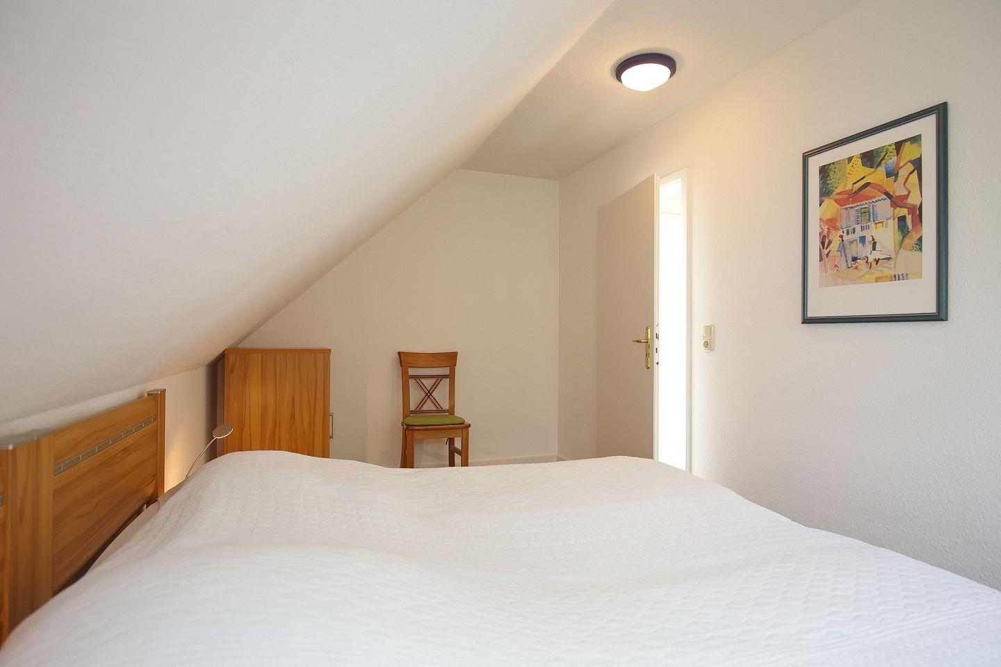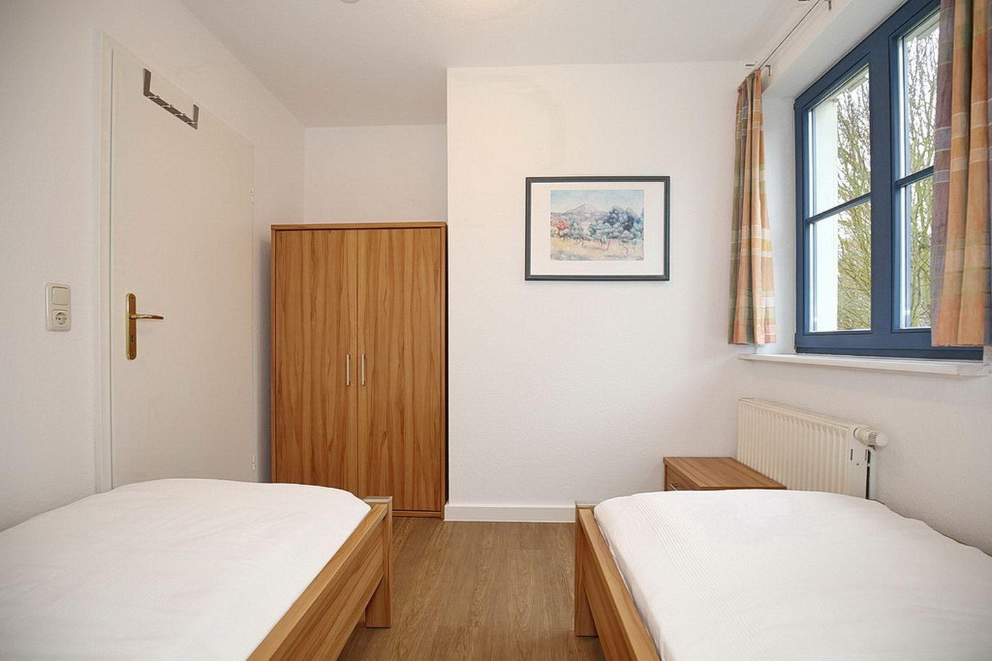 Im unteren Wohnbereich liegt ein Schlafzimmer mit zwei Einzelbetten (90 x 200 cm) und einem Kleiderschrank. Der große Kleiderschrank auf dem Flur bietet Platz für dein Urlaubsgepäck. Über die innenliegende Treppe kommst du in die Schlafzimmer im Dachgeschoss. Diese sind mit zwei zusammengeschobenen Einzelbetten (2 x 90 x 200 cm) ausgestattet.