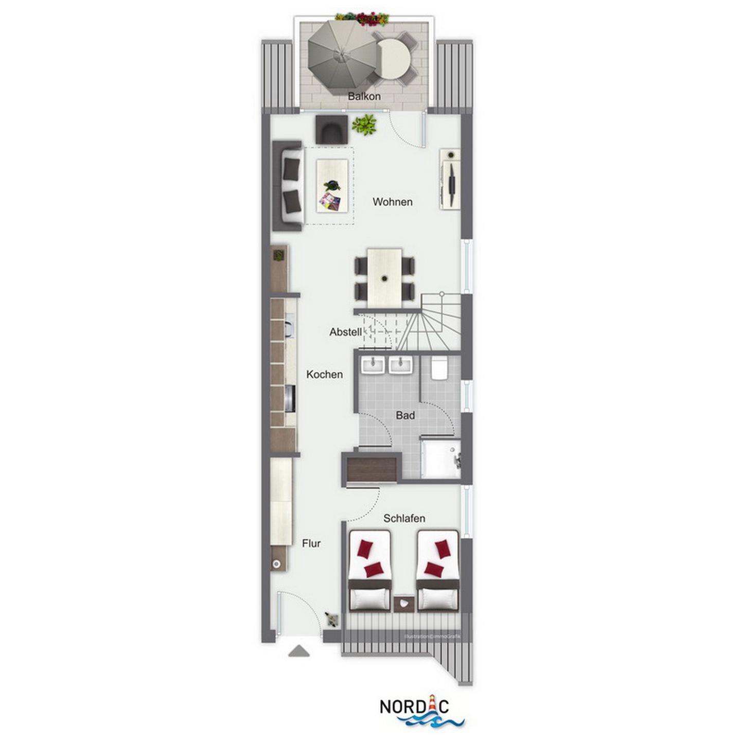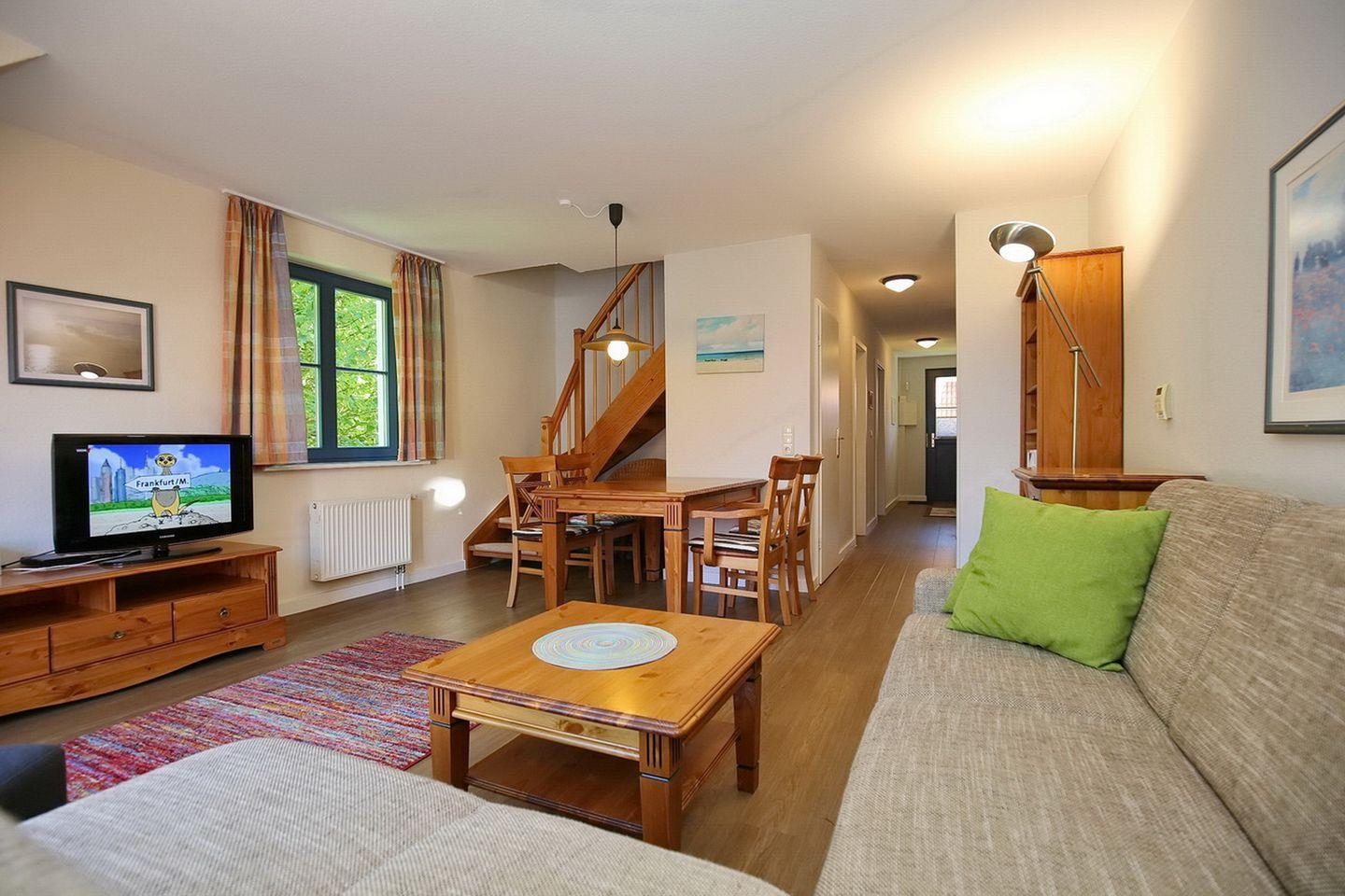 Zur Wohnung gehört ein möblierter Balkon. Dieser ist zugänglich über das Wohnzimmer. Hier kannst du es dir auf einem bequemen Schlafsofa (160 x 200 cm) gemütlich machen. Der Flachbild-TV, DVD-Player und eine Auswahl an Büchern und Spielen sorgen für Abwechslung. Am Esstisch finden sechs Personen Platz.