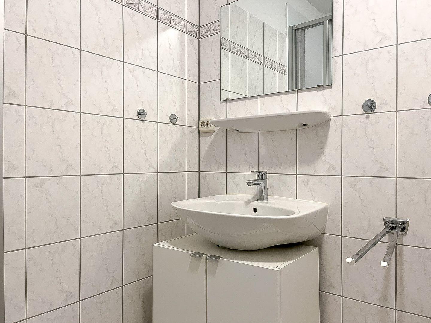 Das geflieste Duschbad bietet viele Abstellmöglichkeiten. In dieser Nichtraucherwohnung sind Haustiere nicht erlaubt.