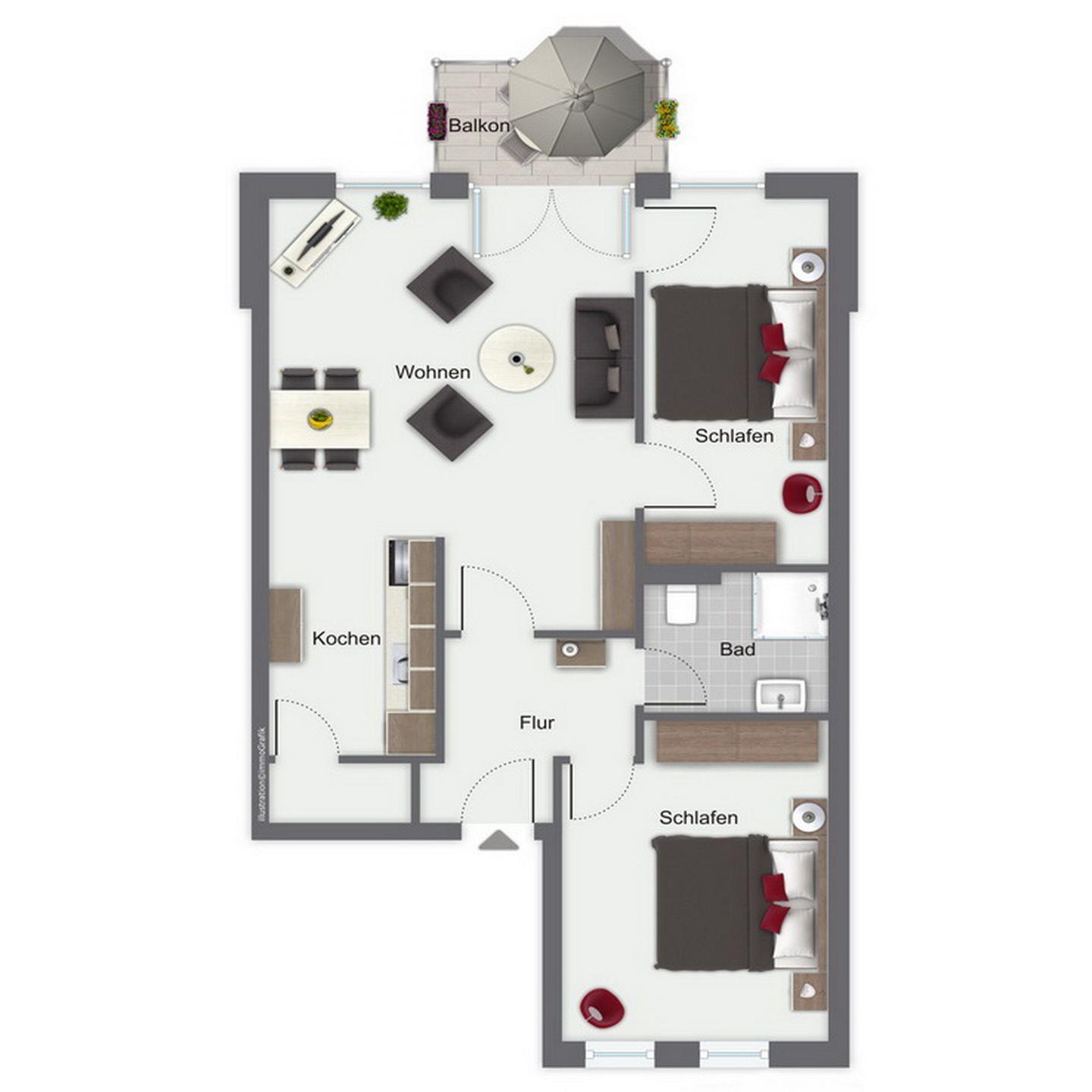 Die 3 Zimmerwohnung Nr. 57, mit Balkon, im 1. OG der Ferienwohnanlage Sünnslag verfügt über ein Wohnzimmer mit Küchenzeile sowie zwei separate Schlafzimmer mit Schlafmöglichkeiten für maximal 4 Personen. WLAN (ohne Gewähr) inklusive.