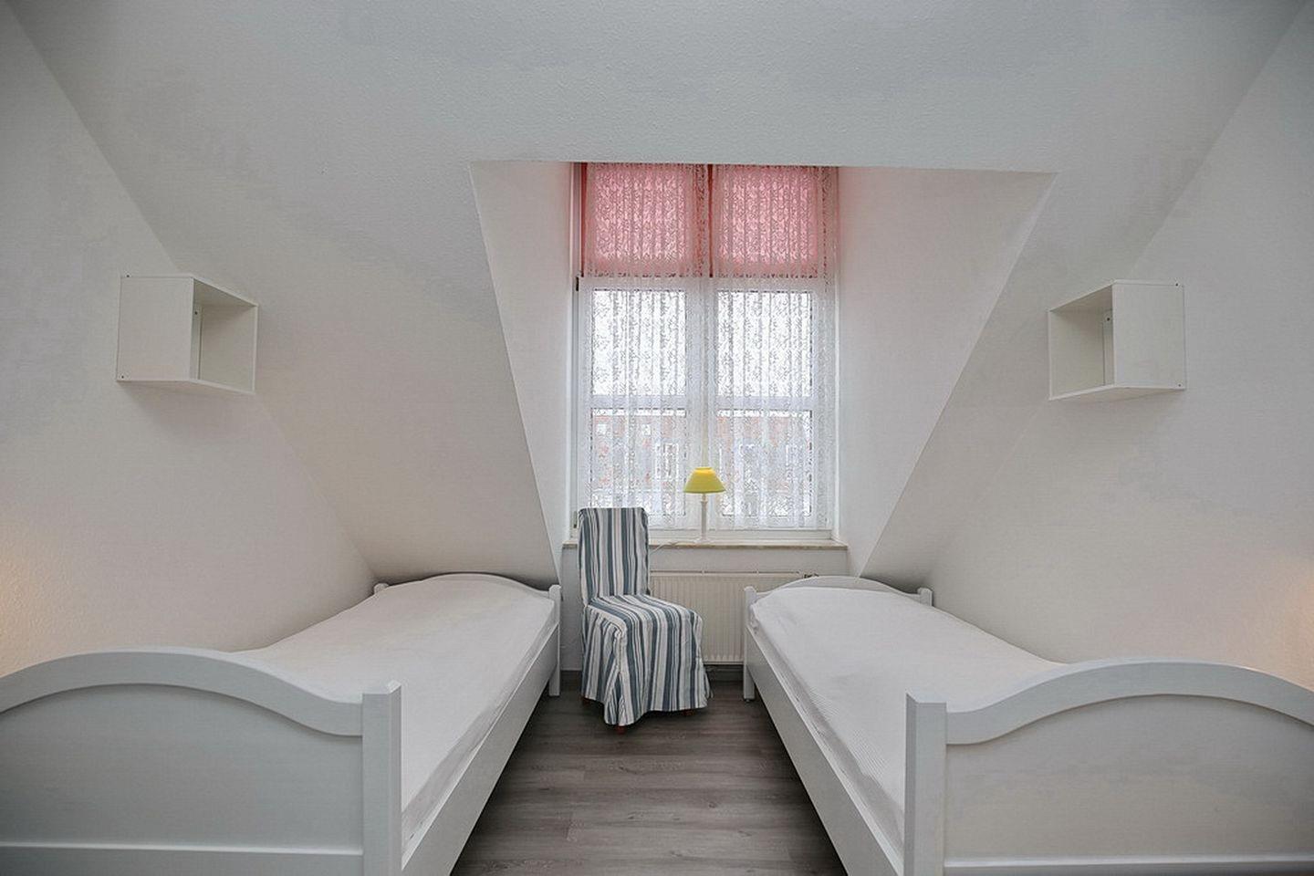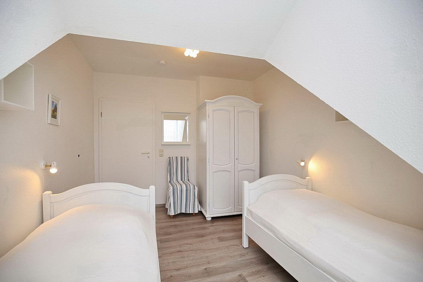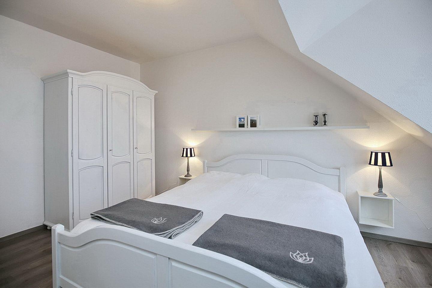 Zur Ausstattung der Schlafzimmer gehören ein Doppelbett (2 x 90 x 200 cm) und zwei Einzelbetten (90 x 200 cm). An den Fenstern sind Vorhänge angebracht. Deine Urlaubsgarderobe findet ihren Platz in den Kleiderschränken.
