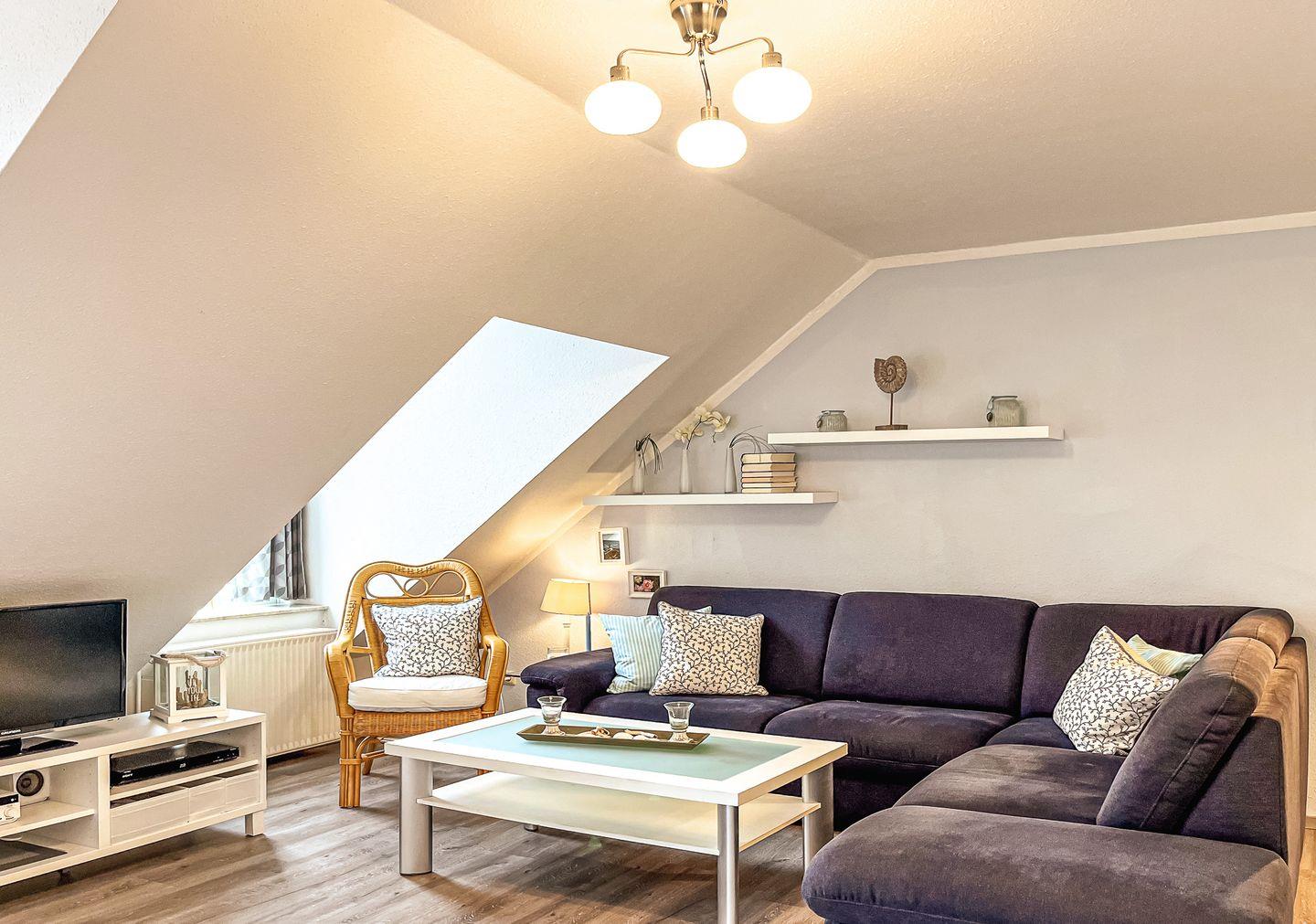 Die 3 Zimmerwohnung Nr. 68 (DG) der Ferienwohnanlage Sünnslag verfügt über 1 Wohnzimmer mit Küchenzeile sowie 2 separate Schlafräume mit max. 4 Schlafplätzen. Der Balkon liegt in Richtung Südost. WLAN (ohne Gewähr) inklusive.