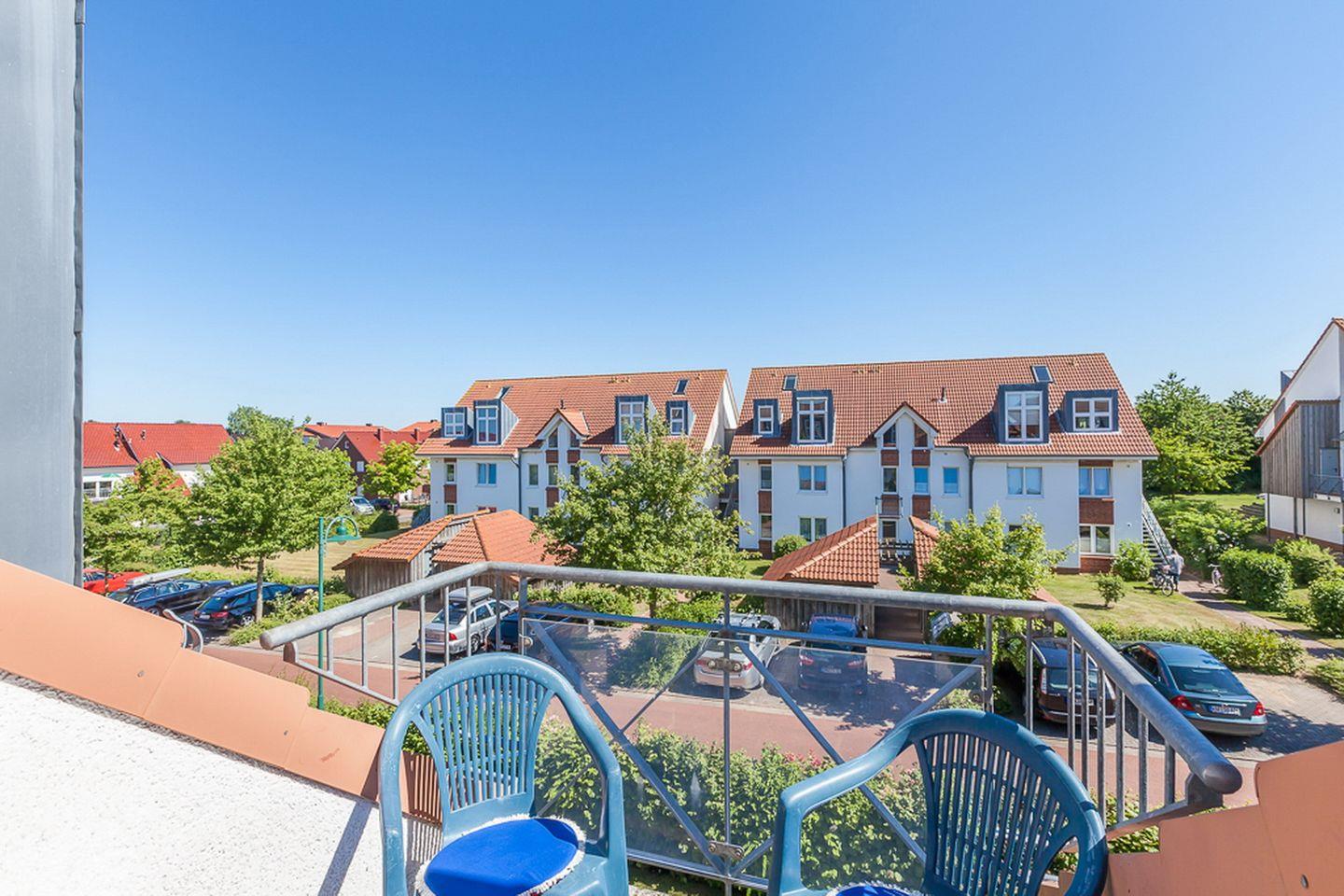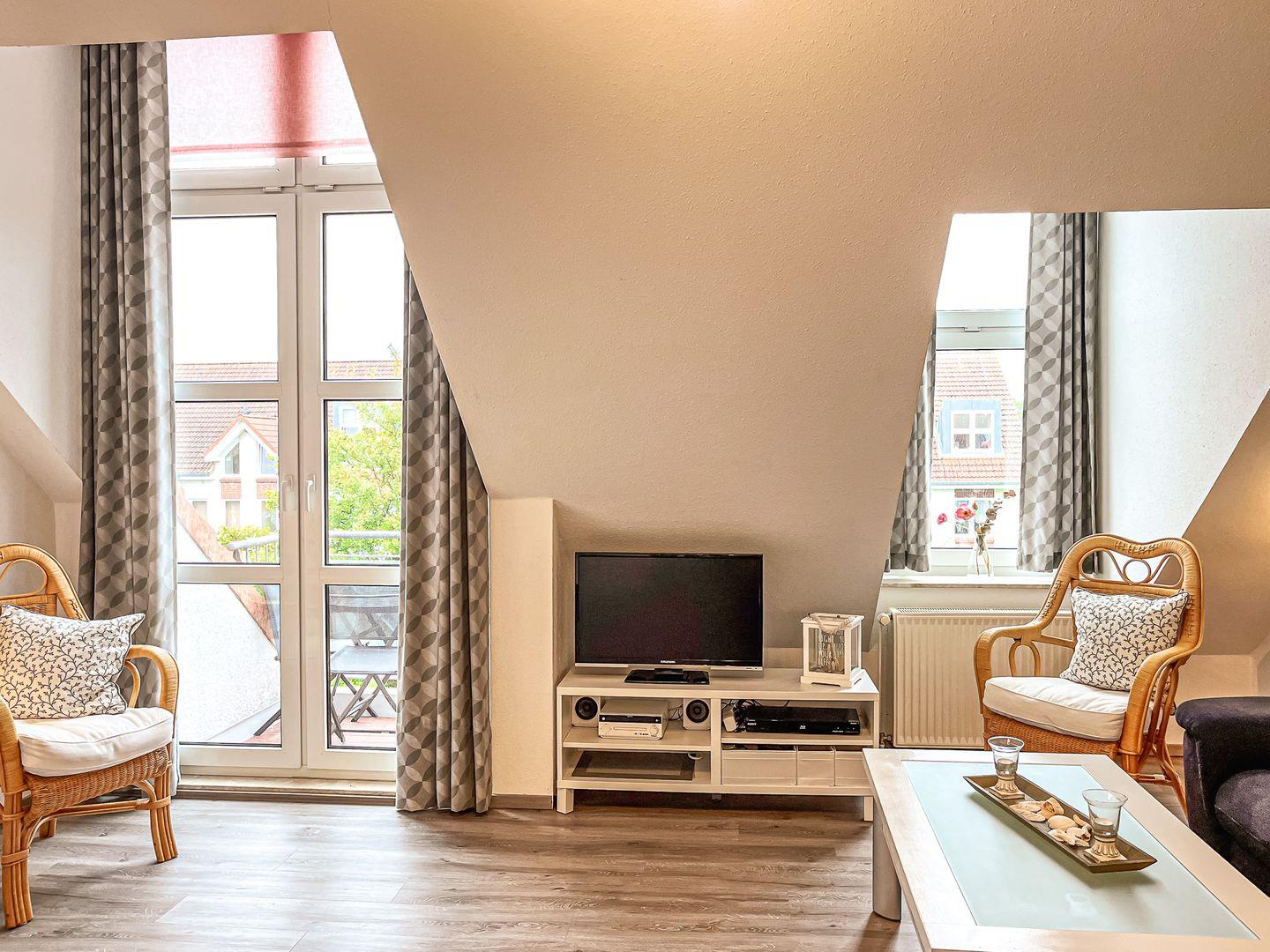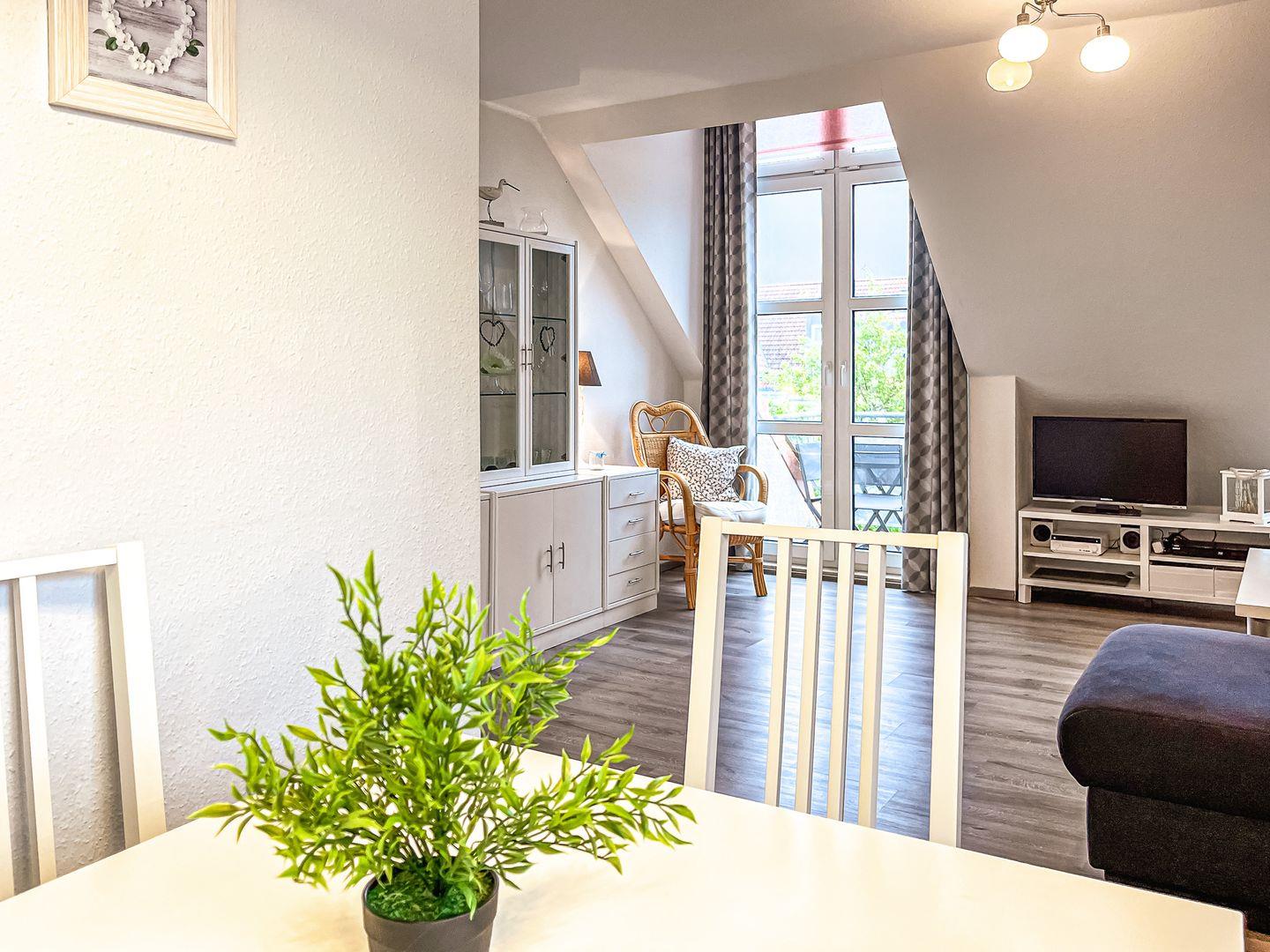 Den Balkon erreichst du vom Wohnzimmer und ist möbliert. Im Wohnbereich findest du eine Couchgarnitur und eine Essecke. Für Unterhaltung sorgen ein Flachbild-TV, ein DVD-Player, eine Mini-Stereoanlage mit Bluetooth und USB-Anschluss.