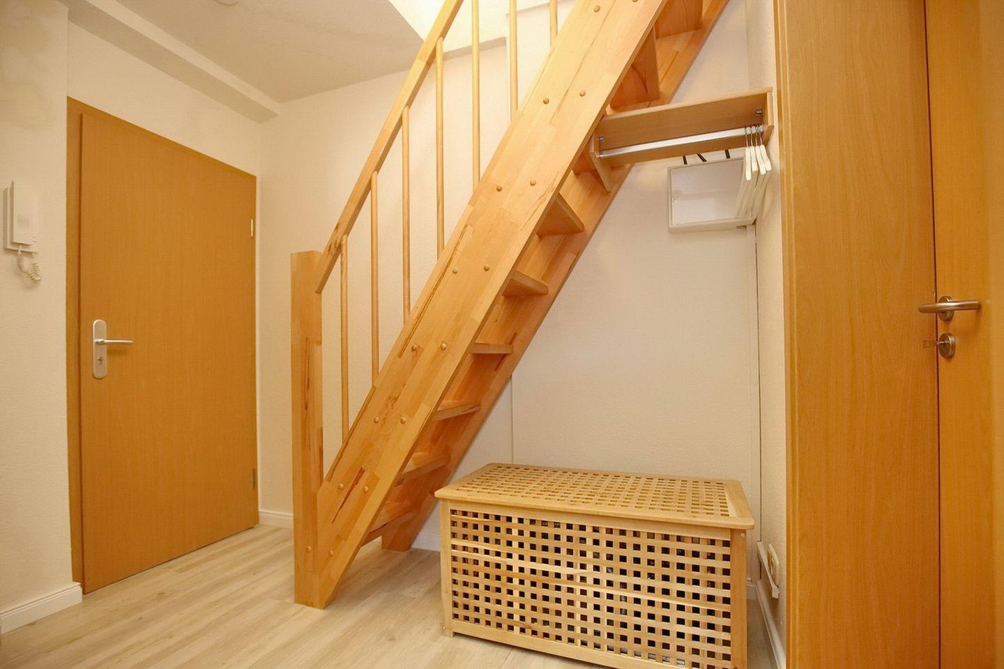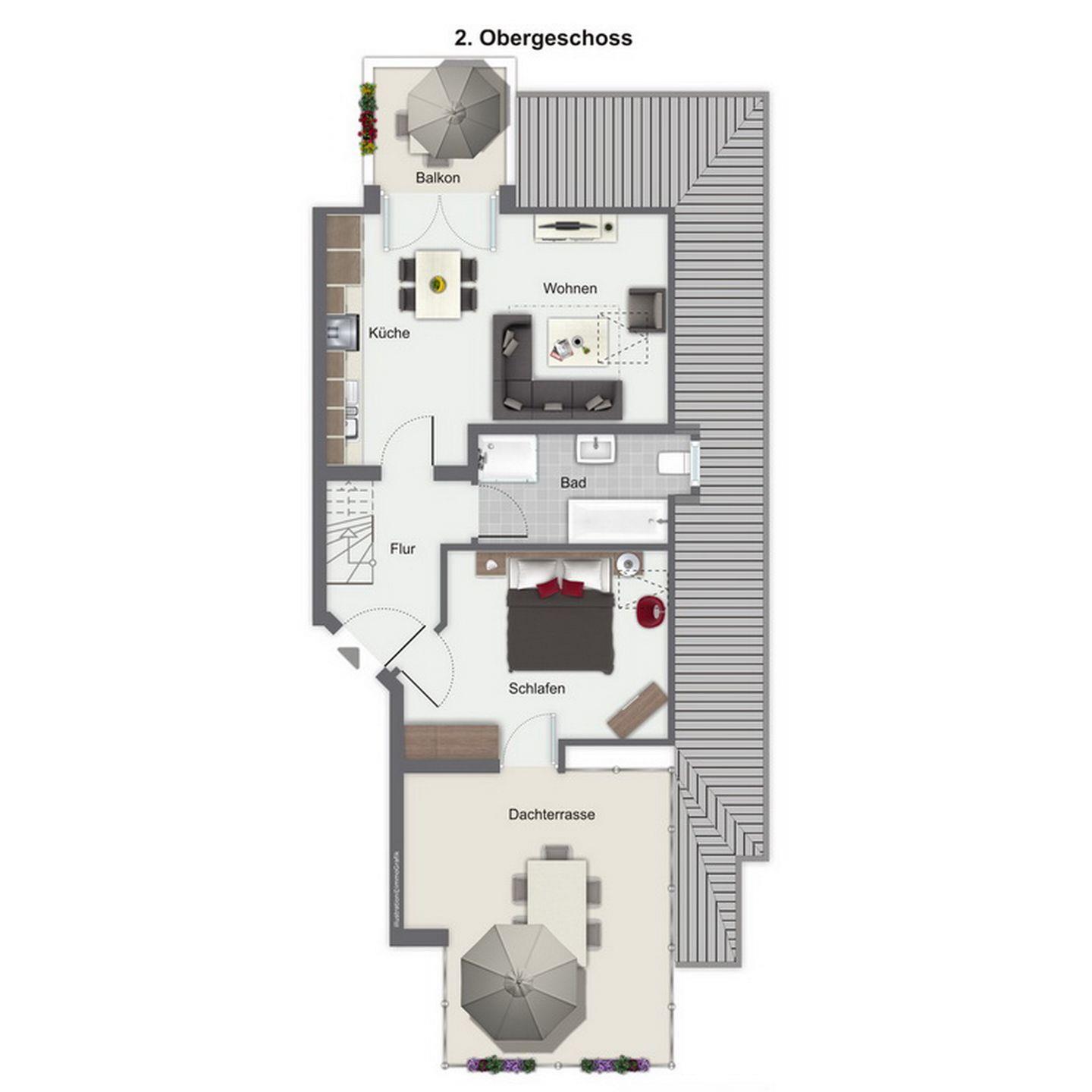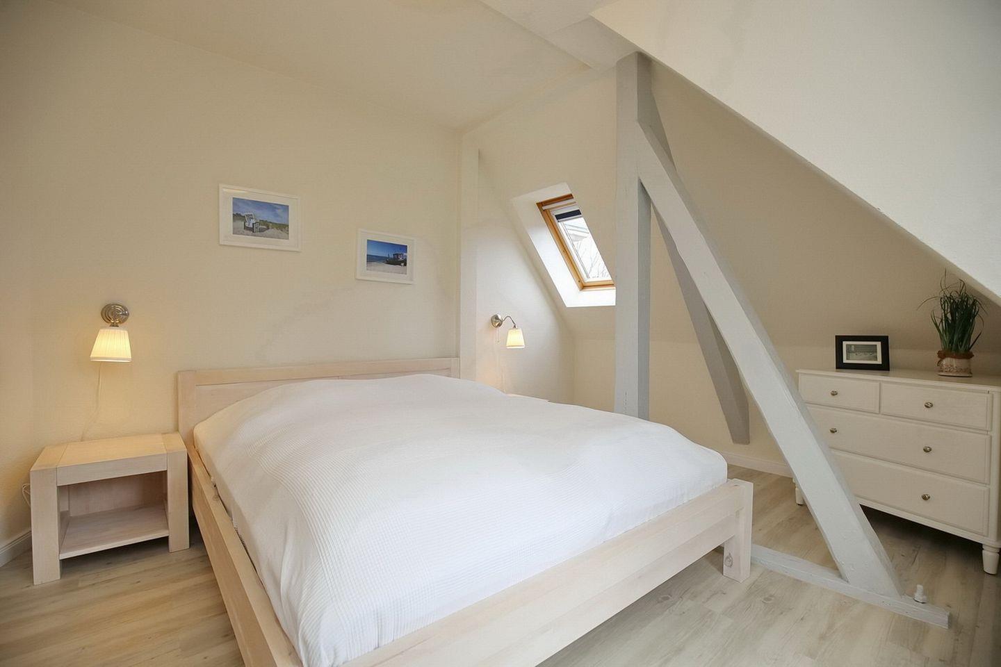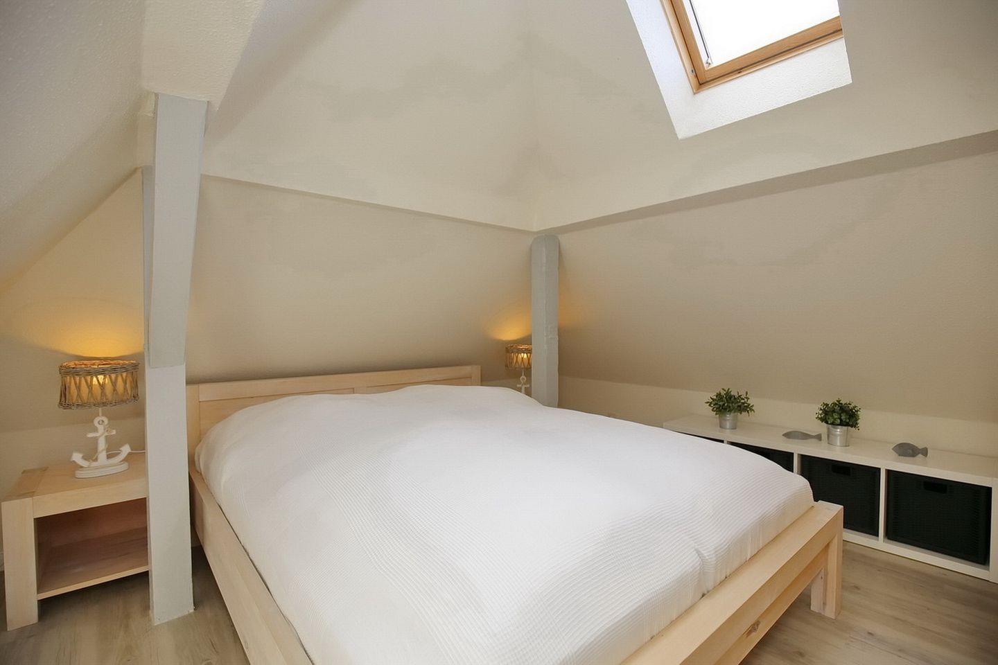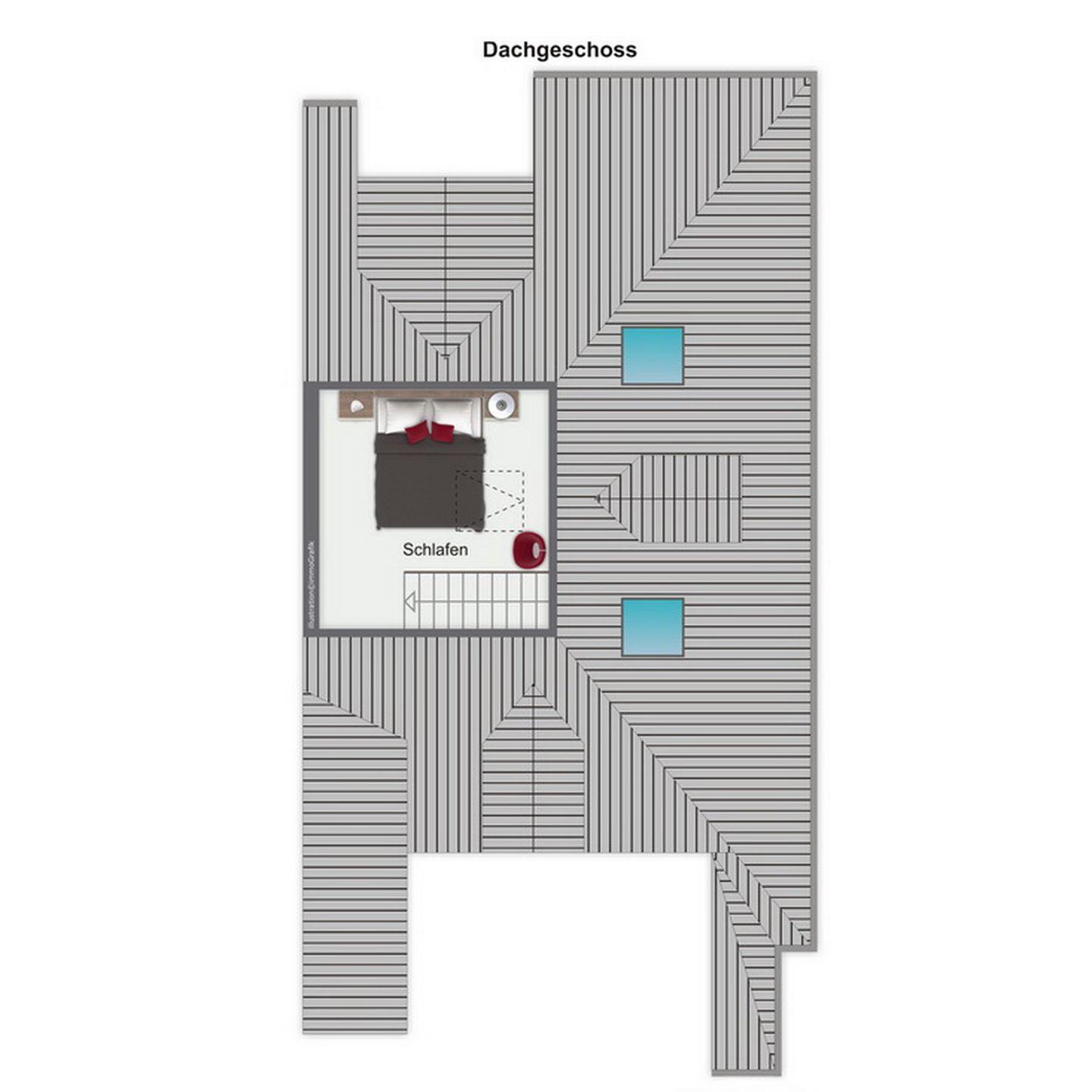 Im unteren Schlafzimmer mit einem Doppelbett (2 x 80 cm x 200 cm) gelangst du auf die südlich ausgerichtete Dachterrasse. Hier kannst du die Sonne genießen. Über eine Treppe vom Flur aus kommst du ins zweite offene Schlafzimmer mit einem Doppelbett (2 x 80 cm x 190 cm).