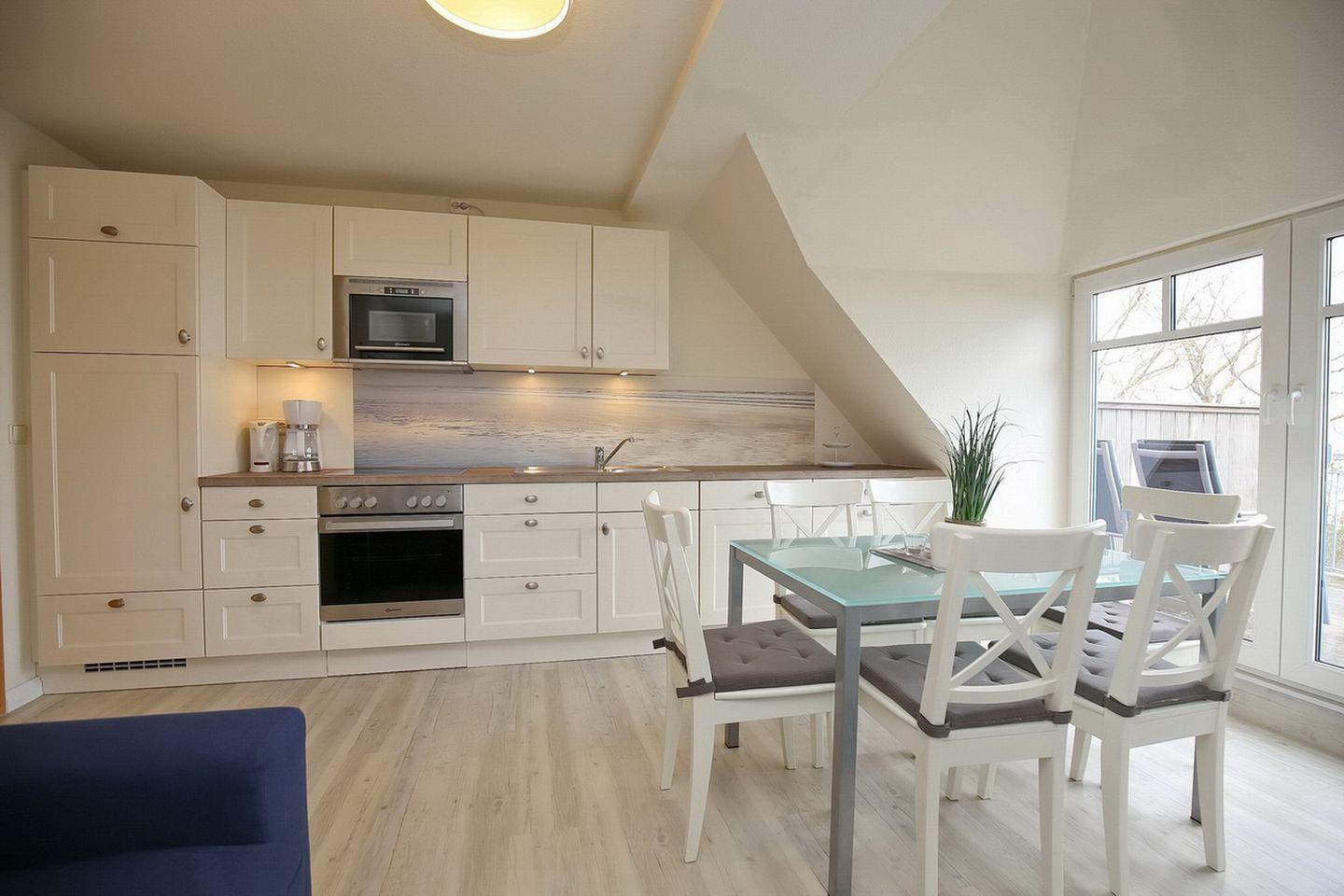 Das Wohnzimmer hat neben dem Essbereich, von dem aus du auch auf die Ostsee sehen kannst, eine voll ausgestattete Küchenzeile. Es stehen dir ein hochwertiges Cerankochfeld, ein Backofen, ein Kühlschrank mit Gefrierschrank, ein Geschirrspüler, eine Mikrowelle und vieles mehr zur Verfügung.