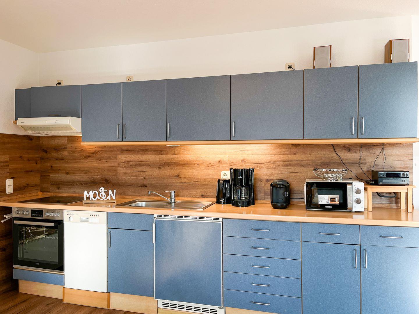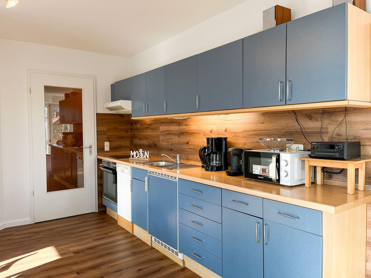 Die gut ausgestattete Küchenzeile verfügt neben ausreichend Geschirr auch über Mikrowelle, Kühlschrank mit Gefrierfach, Geschirrspüler, 4-Plattenkochfeld und Backofen.