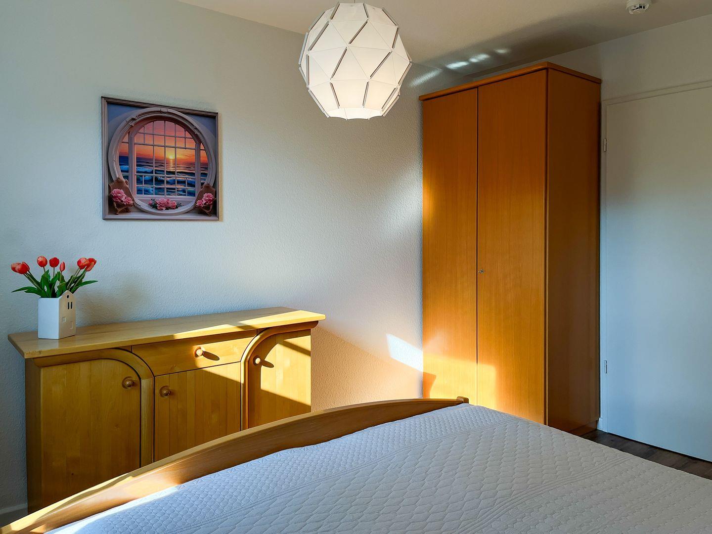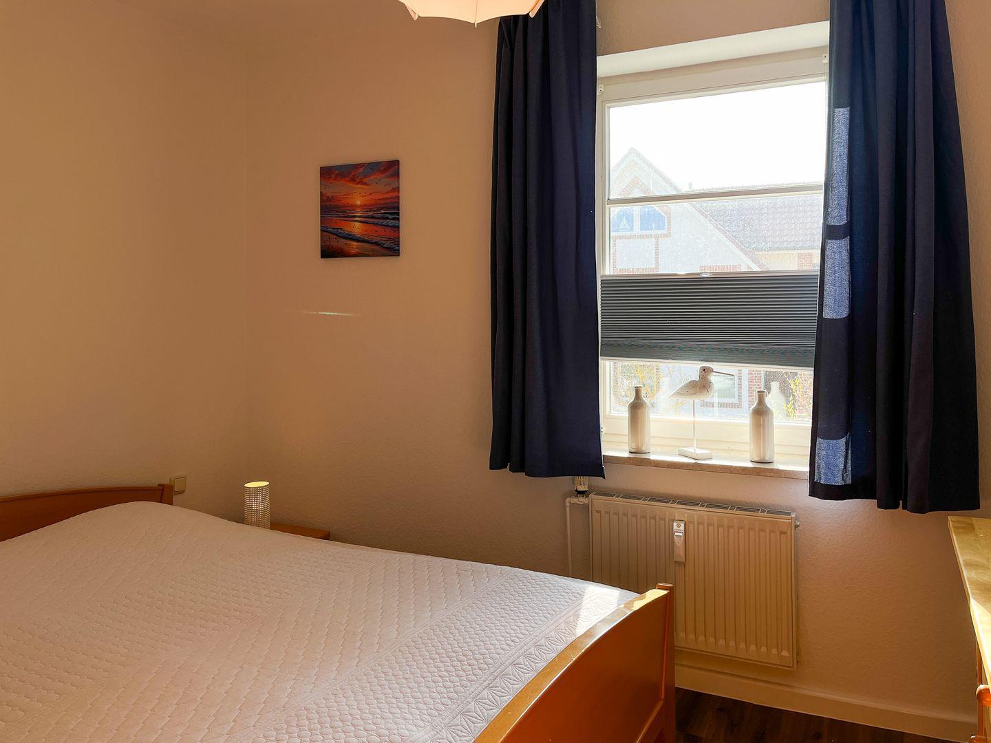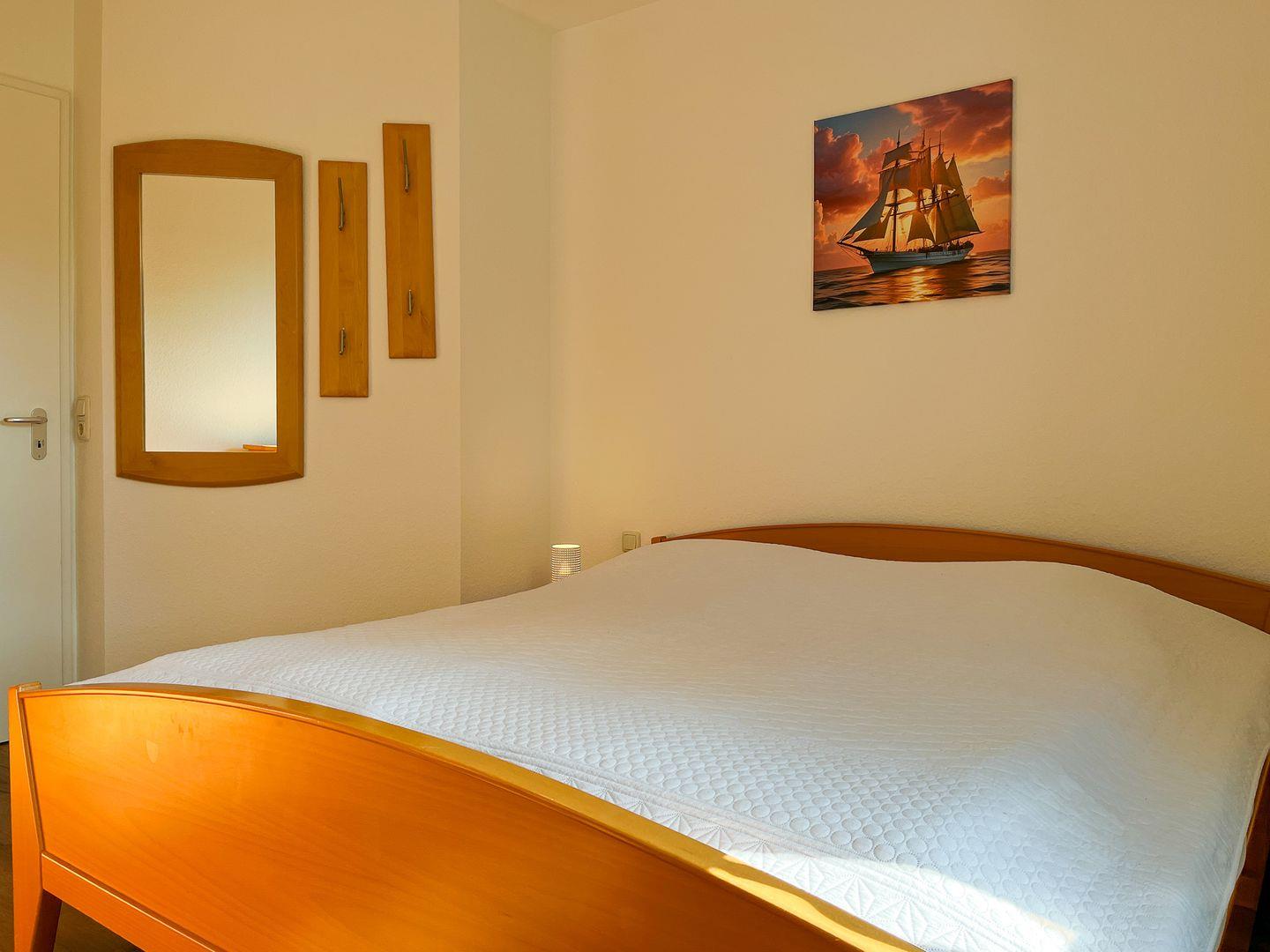 Im Schlafzimmer erwartet Sie ein Doppelbett (2 x 90 x 200 cm). Für eine ungestörte Nachtruhe sorgt ein Verdunklungsrollo am Fenster. Sowohl im Schlafzimmer als auch im Flur befinden sich geräumige Kleiderschränke für Ihr Urlaubsgepäck.