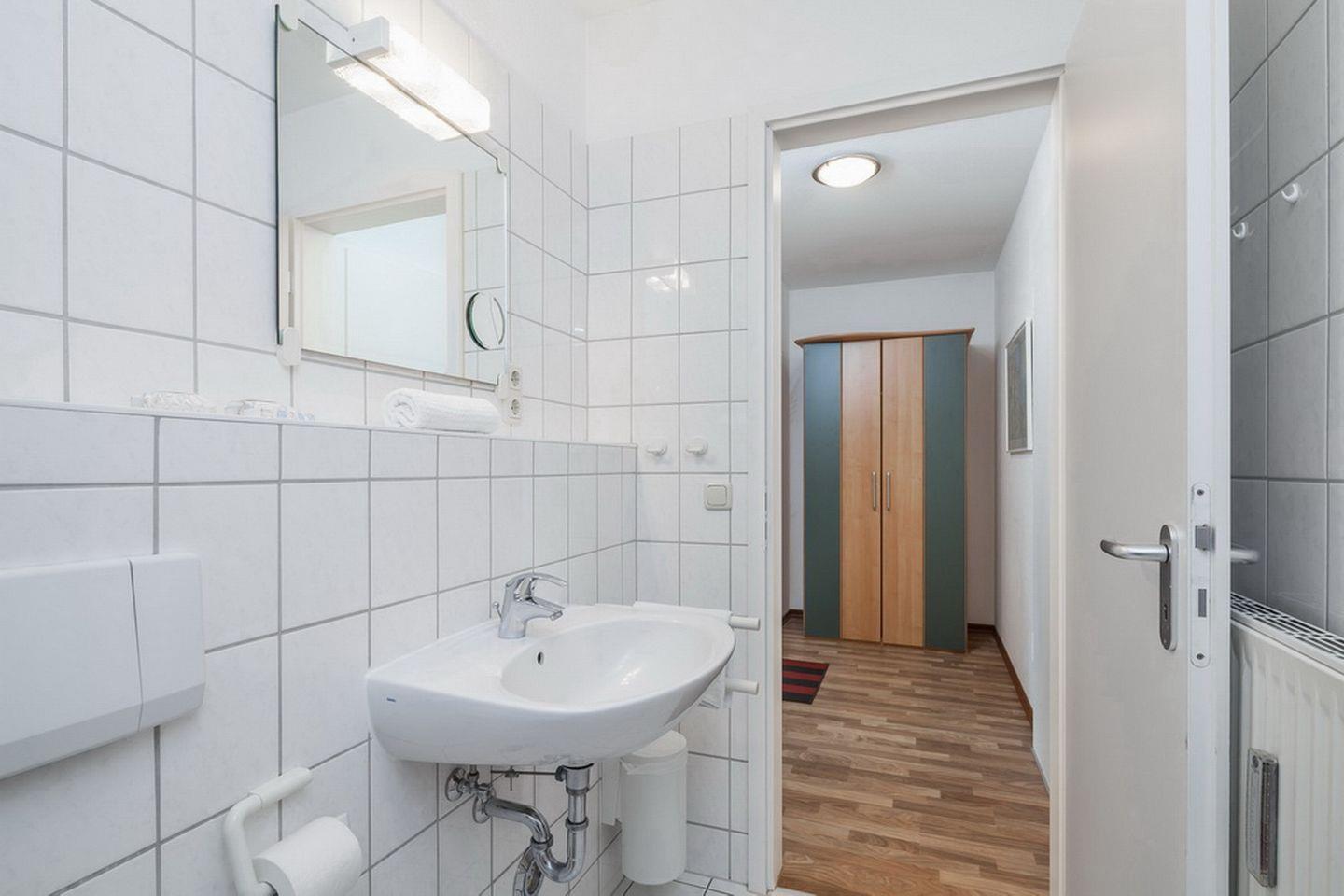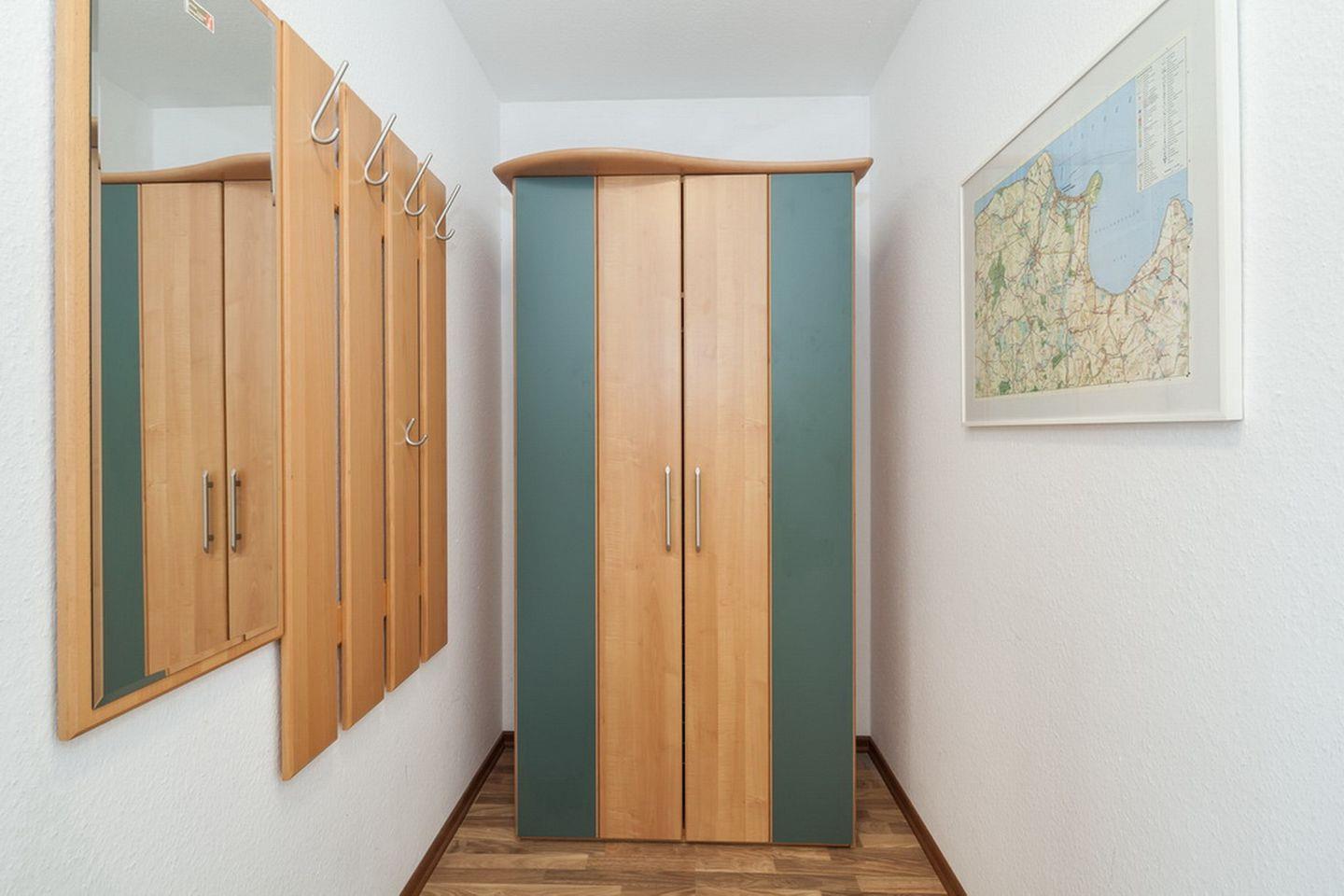 Das Schlafzimmer verfügt über ein Doppelbett (2 x 90 x 200 cm) und ein kleines Einzelbett (160 x 70 cm ), dies ist nur für Kinder gedacht. Ihre Urlaubsgarderobe kann im Kleiderschrank untergebracht werden. Vorhänge dienen in der Ferienwohnung als Abdunkelung. An allen Fenstern befinden sich Plissees.