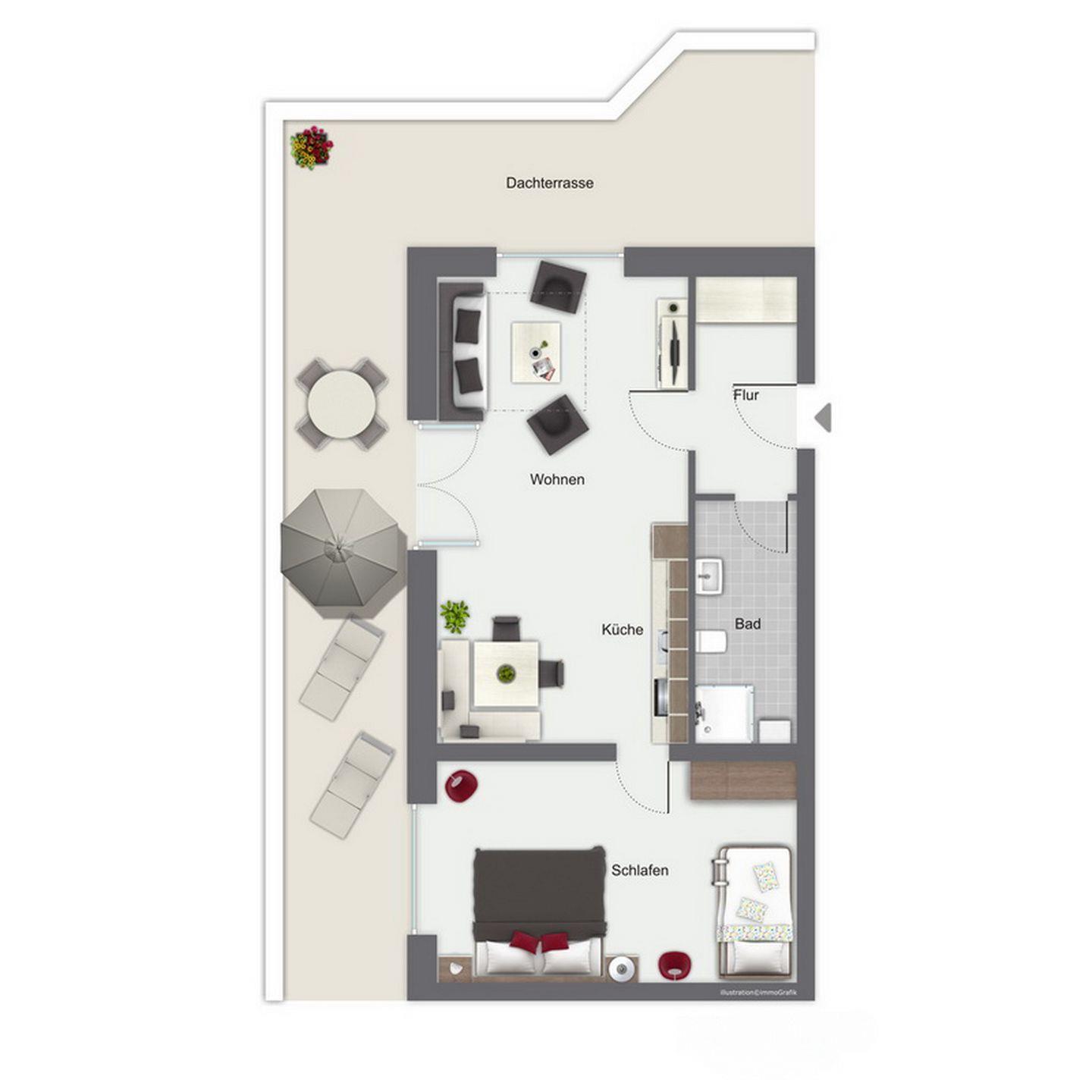 Küchen- und Nassbereich sind gefliest, Schlaf- und Wohnraum haben Laminatboden. In dieser Nichtraucherwohnung sind Haustiere nicht erlaubt. Ein Tiefgaragenstellplatz (Einfahrtshöhe 2,10 m) sorgt für die sichere Unterbringung Ihres Autos.