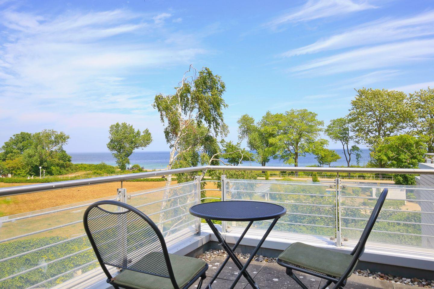 Von der möblierten Dachterrasse mit Zugang vom Wohnzimmer genießen Sie den Teilseeblick auf die Ostsee. Die bequeme Couch mit Schlaffunktion (120 x 200 cm) und der Essplatz für 4 Personen laden Sie zum gemütlichen Miteinander ein. Für Unterhaltung sorgen ein Flachbild-TV, eine Stereoanlage und eine Auswahl an Büchern.