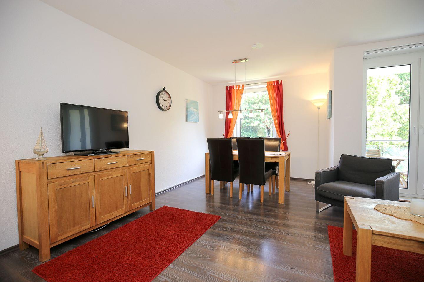 Aus dem Wohnzimmer betrittst du den in Süd-Ost-Lage ausgerichteten möblierten Balkon mit Blick ins Grüne. Die bequeme Schlafcouch (160 x 200 cm) bietet eine Schlafmöglichkeit für zwei Personen. Ein Flachbild-TV sorgt für Abwechslung.