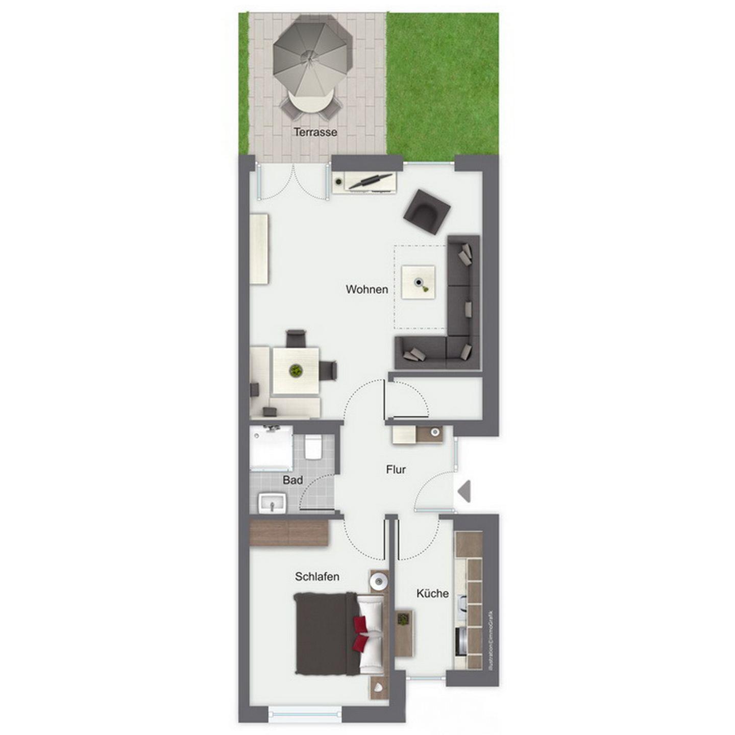 Auf ca. 53 m² erwartet dich im Erdgeschoss diese freundliche 2-Zi.-Wohnung mit eigenem Zugang. Für einen erholsamen Urlaub stehen dir ein Wohnzimmer mit Essbereich, eine separate Küche, ein Schlafzimmer, ein Duschbad und eine Terrasse (inkl. 2 Liegen) zur Verfügung. Die Entfernung zum Strand beträgt von der Ferienanlage Sünnslag ca. 400 m.