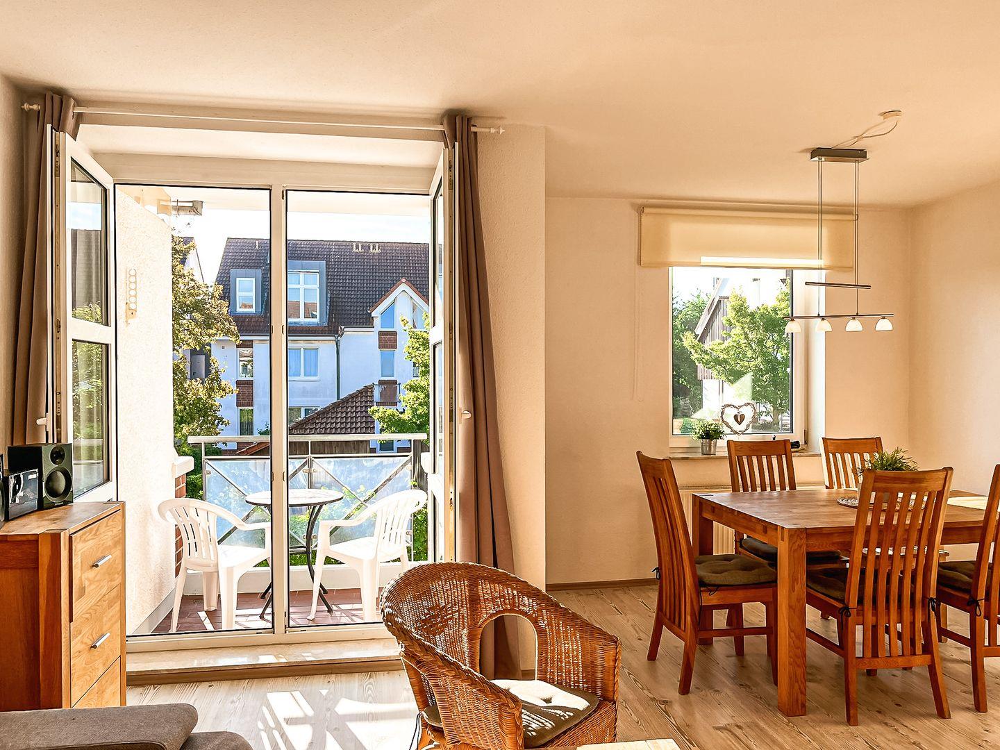 Im großzügigen und mit natürlichen Möbeln gestalteten Wohnraum steht neben der sonnigen Essecke ein Sitzbereich mit komfortabler Doppel-Schlafcouch (160 x 200 mit Holzlattenrosten) zur Verfügung. Hier sind auch ein Flachbildfernseher, ein DVD-Player sowie eine Hi-Fi-Anlage (mit Radio, CD/MP3, USB-Anschluss) vorhanden. Ein Kinderhochstuhl, einige Gesellschaftsspiele, Bücher und Musik-CDs ergänzen die Ausstattung.