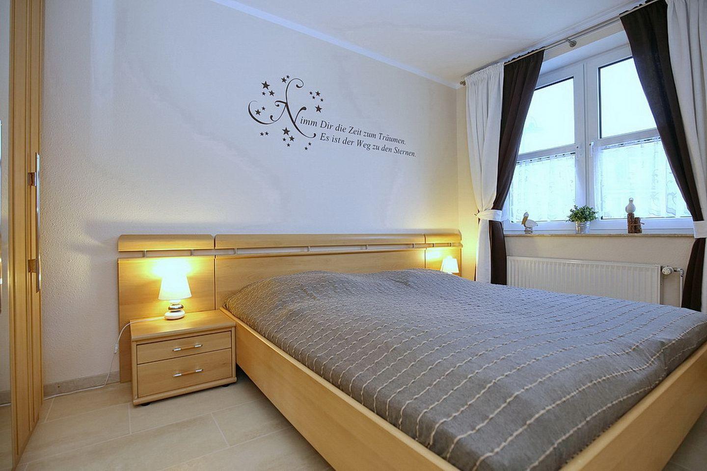 Ein Schlafzimmer mit einem Doppelbett (2 x 90 x 200 cm) und einem Kleiderschrank lädt zum Träumen ein. Die Fenster werden hierzu mit Vorhängen verdunkelt.