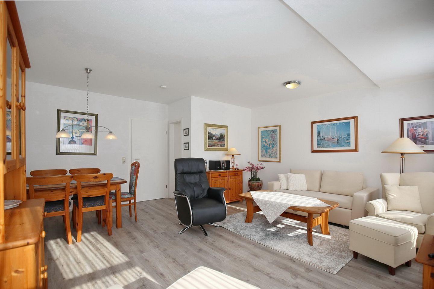 Auf ca. 54 m² erwartet dich die im Erdgeschoss gelegene behagliche 2-Zi.-Wohnung mit eigenem Zugang. Für erholsame Urlaubstage stehen ein Wohnzimmer, ein Schlafzimmer, eine separate Küche, ein Duschbad und eine Terrasse zur Verfügung. Die Entfernung zum Strand beträgt von der Ferienanlage Sünnslag ca. 400 m.