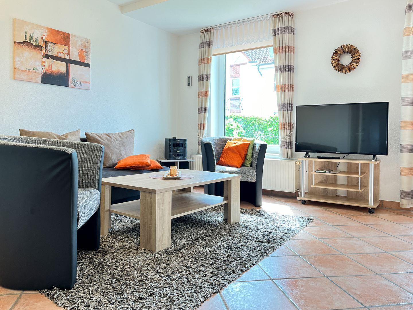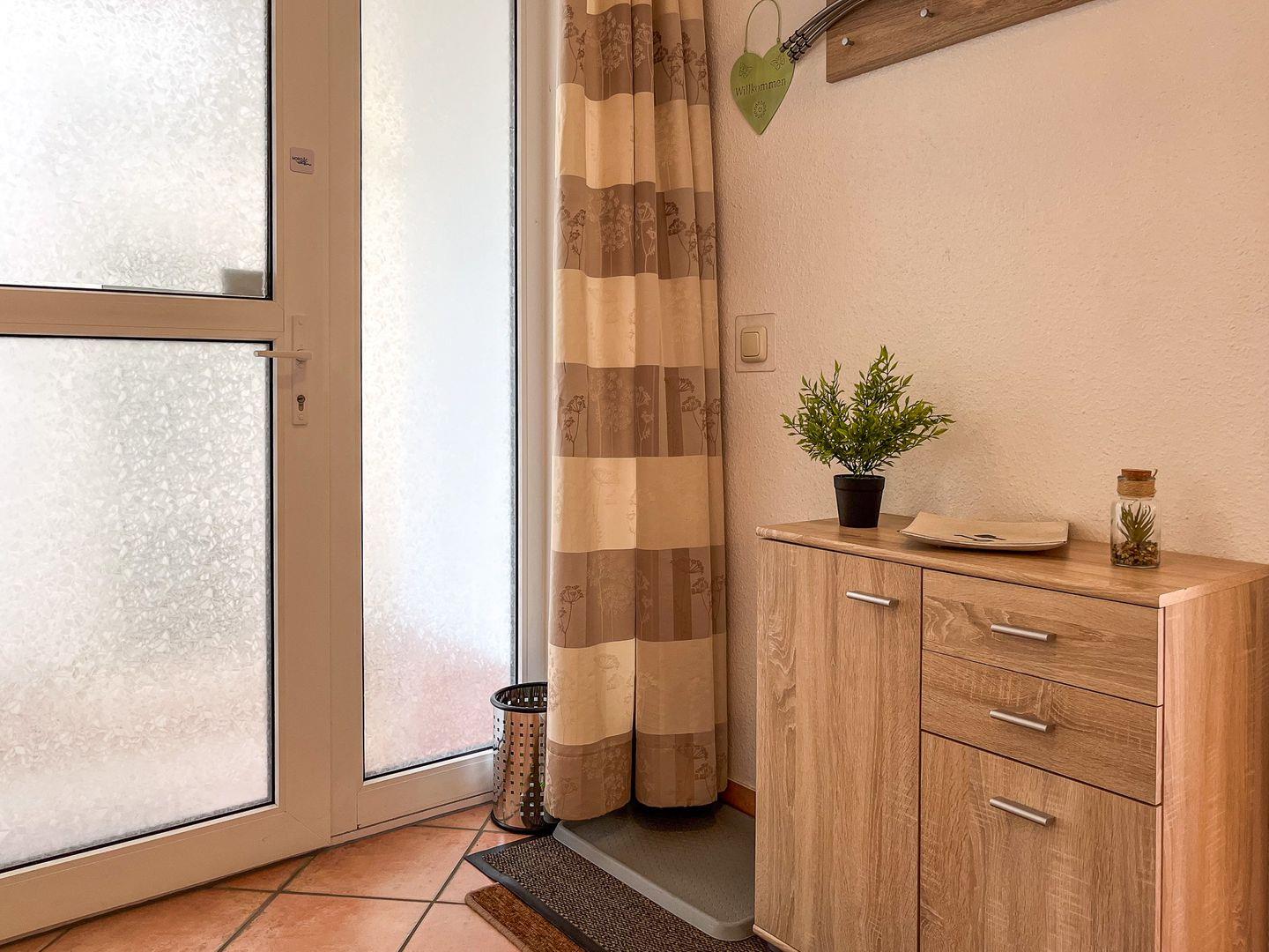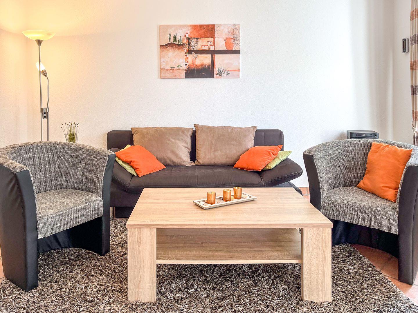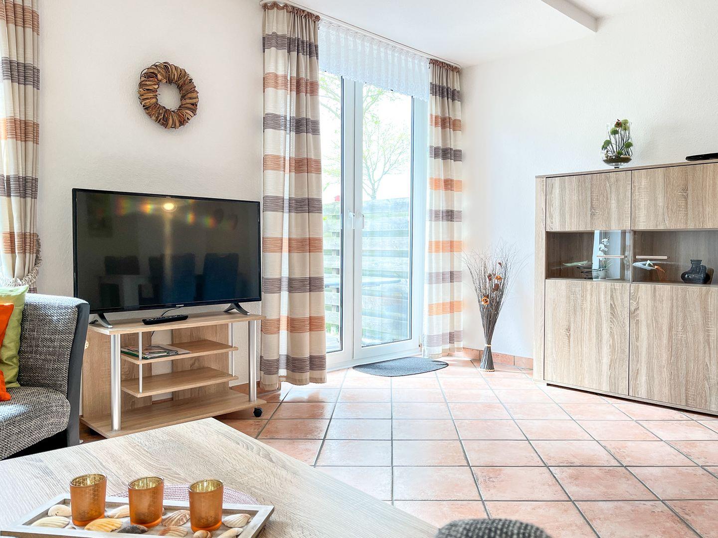 Auf einer Fläche von ca. 53 m² bewohnst du eine moderne Wohnung im Erdgeschoss mit einem eigenen Zugang. Für erholsame Ferientage stehen dir ein Wohnzimmer mit Essbereich, ein Schlafzimmer, eine separate Küche, ein Duschbad und eine Terrasse (inkl. 2 Liegen) zur Verfügung. Die Entfernung zum Strand beträgt von der Ferienanlage Sünnslag ca. 400 m.