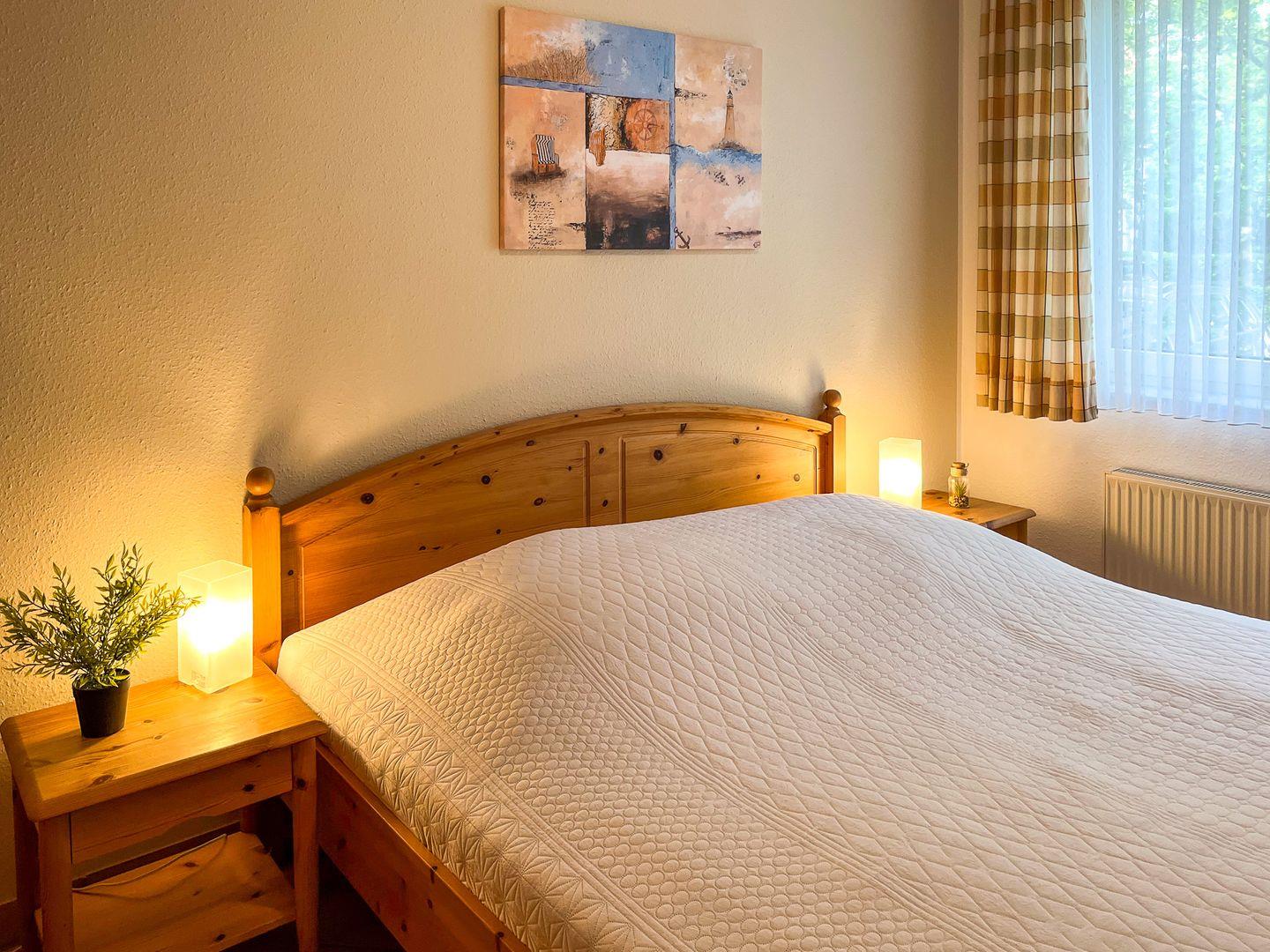 Im Schlafzimmer sorgt das große Doppelbett (2 x 90 x 200 cm) für erholsamen Schlaf. Deine Urlaubsgarderobe findet in dem geräumigen Kleiderschrank ihren Platz. Zur Verdunkelung dienen Vorhänge und ein Rollo. Zusätzlich ist ein Fliegengitter vorhanden.
