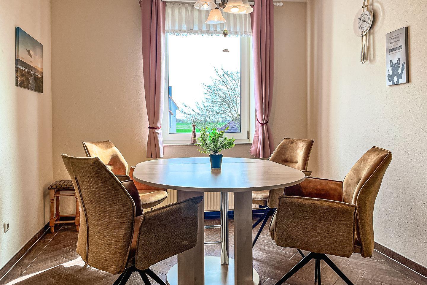 Die Küche der Ferienwohnung ist mit Geschirrspüler, Kühlschrank mit Gefrierfach, Backofen mit 4- Plattenkochfeld und Mikrowelle eingerichtet. Eine Waschmaschine kann hier ebenfalls genutzt werden. Die Essecke befindet sich im Wohnraum.