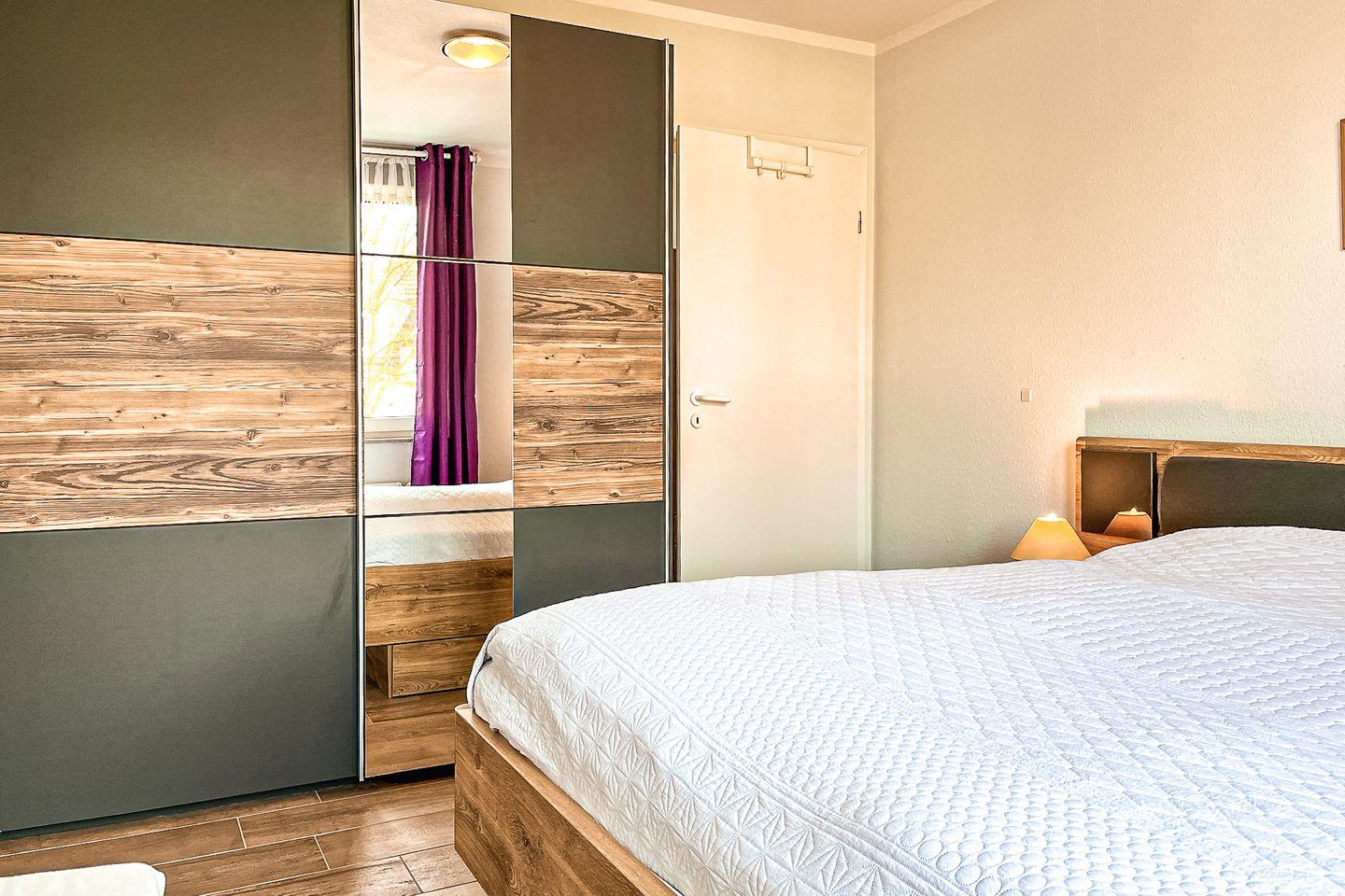 Das Schlafzimmer ist mit einem Doppelbett (2 x 90 x 200 cm) und einem Kleiderschrank ausgestattet. An den Fenstern sind Vorhänge zur Verdunkelung angebracht.
