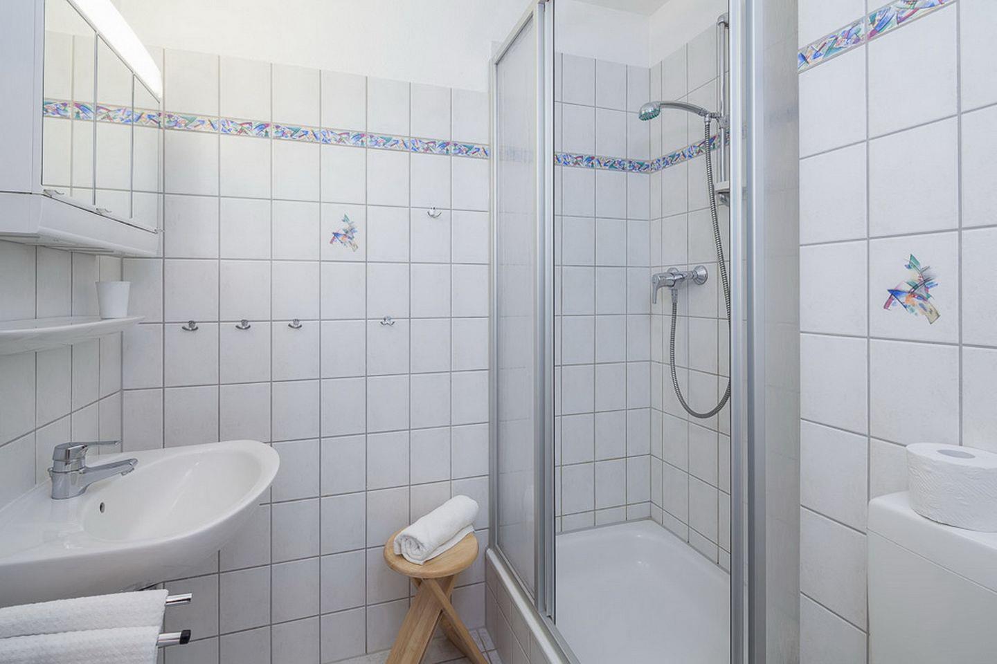 Ein Duschbad ist vorhanden. Der Boden in der Ferienwohnung ist mit Teppich und Fliesen ausgelegt. In dieser Nichtraucherwohnung sind Haustiere nicht erlaubt.