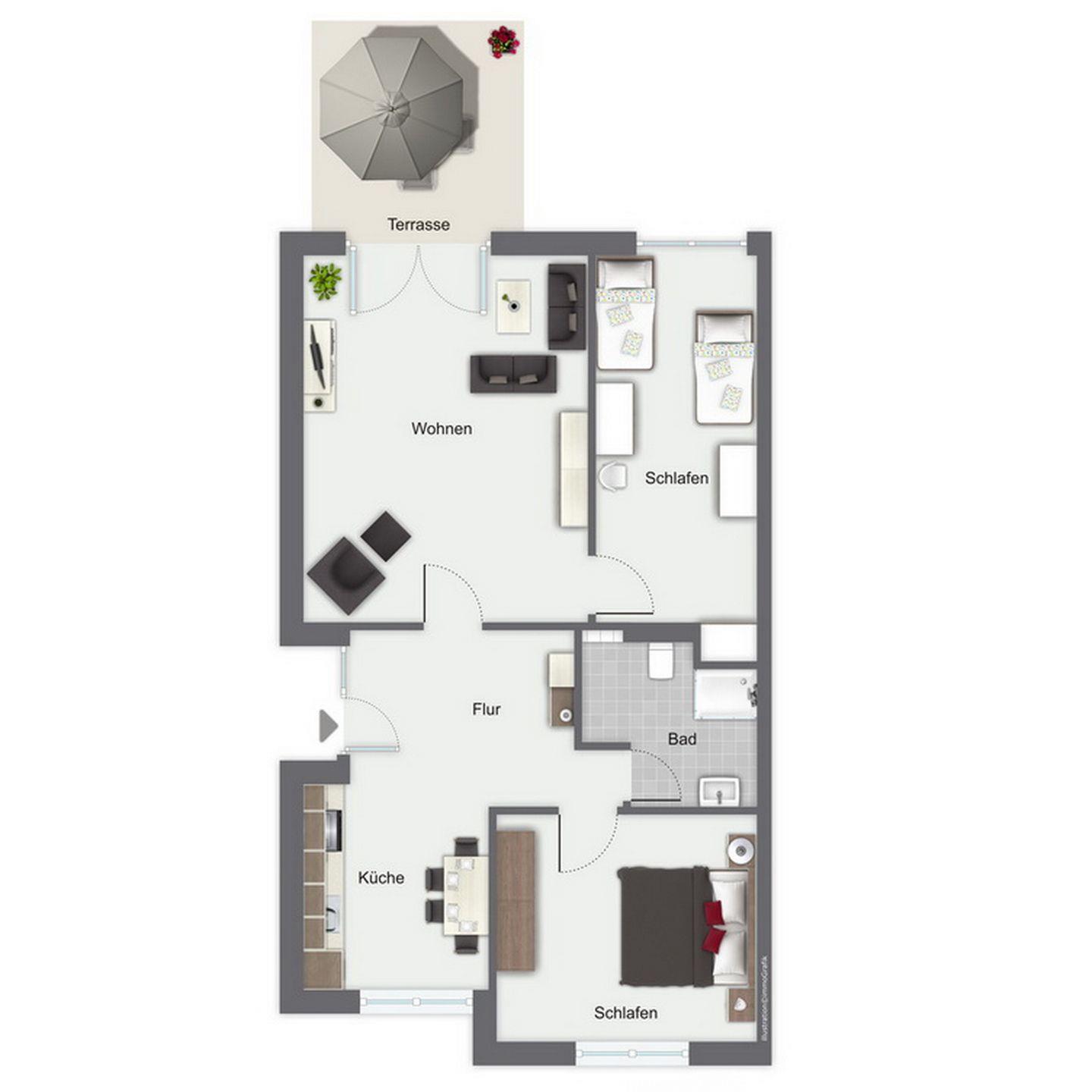 Für erholsamen Schlaf stehen dir im Schlafzimmer ein Doppelbett (2 x 90 x 200 cm) und zwei Einzelbetten (90 x 200 cm) zur Verfügung. Die Räume werden mit Vorhängen verdunkelt. Dein Reisegepäck verstautst du in einem Kleiderschrank bzw. einer Kommode. Das Duschbad erreichst du über den Flur. Als Bodenbelag wurde in der Ferienwohnung Laminat gewählt. In dieser Nichtraucherwohnung sind Haustiere nicht erlaubt.