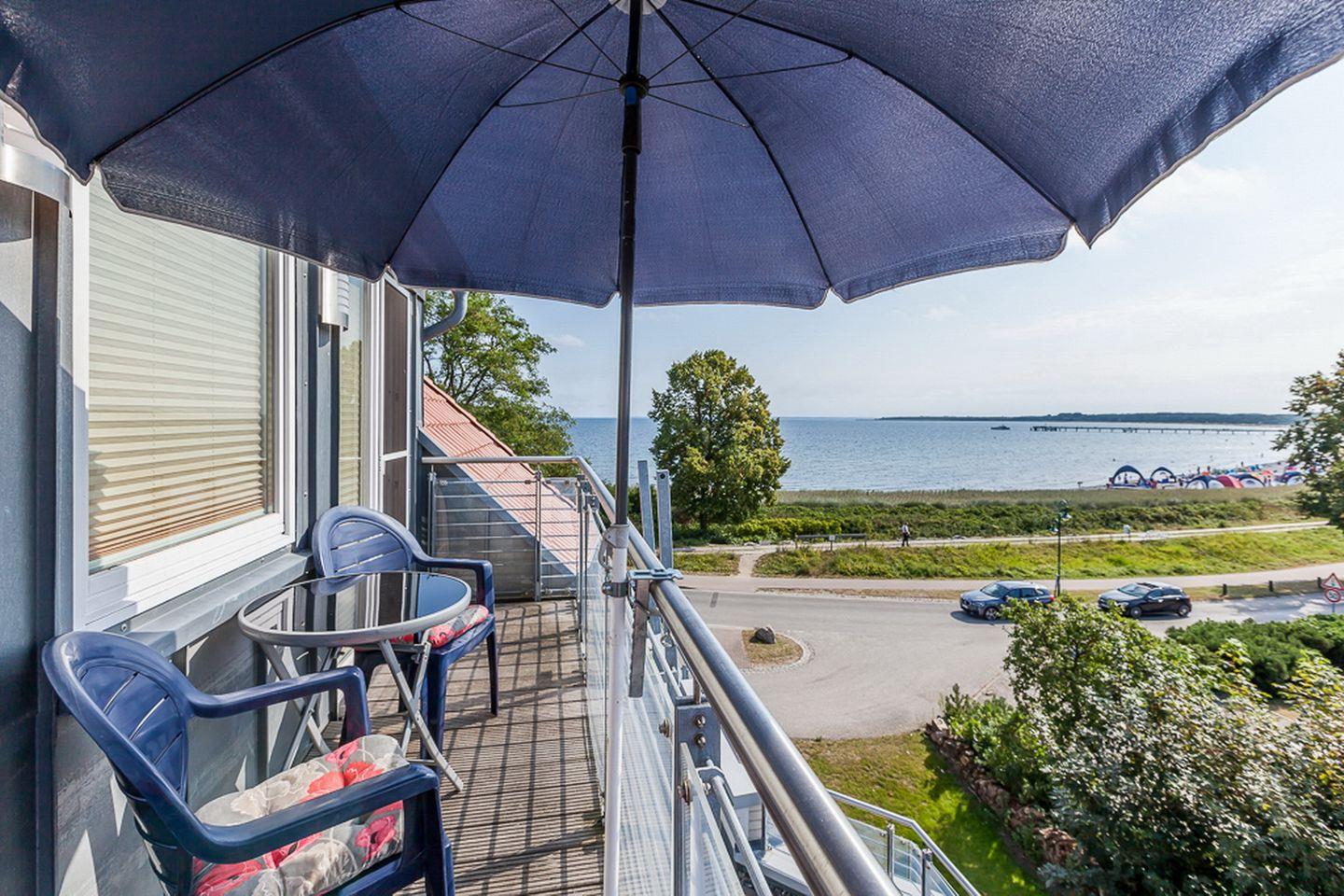 Aus dem Wohnzimmer heraus betreten Sie den möblierten Balkon, auf dem Sie die frische Ostseeluft und einen wunderschönen Seeblick genießen können. Im Wohnbereich sorgen ein Schlafsofa (160 x 200 cm) und die Essecke für einen angenehmen Aufenthalt. Zur Unterhaltung stehen ein Flachbild-TV und eine Stereoanlage bereit.