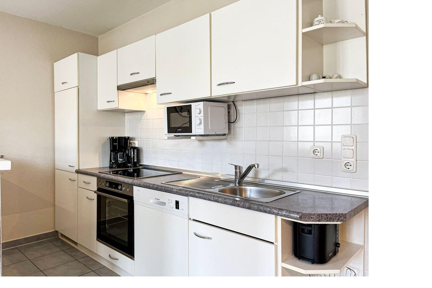Die geflieste Küchenzeile ist ausgestattet mit einem 4-Platten-Cerankochfeld mit Backofen, Geschirrspüler, Mikrowelle und einem Kühlschrank mit Gefrierschrank. Am gemütlichen Essplatz kannst du deine Mahlzeiten genießen. Das geflieste Duschbad/WC verfügt auch über ein Fenster.