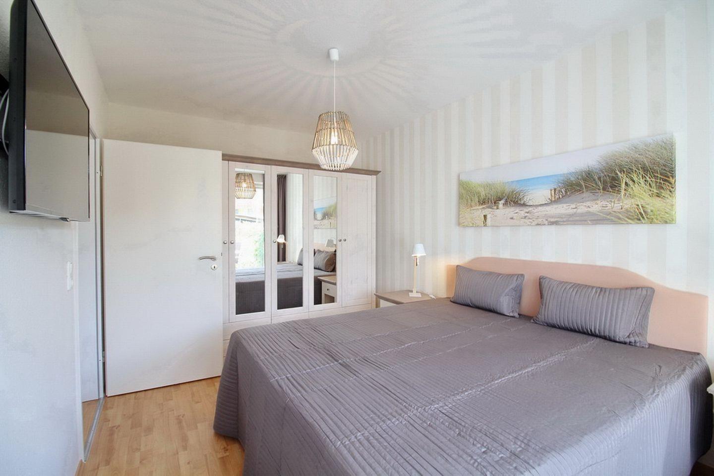 Ein komfortables Boxspringbett (2 x 90 x 200 cm) im Schlafzimmer bietet erholsamen Schlaf. In dem 3-türigen Kleiderschrank findest du viel Platz für deine Urlaubsgarderobe. Außerdem kannst du hier einen Flachbildfernseher nutzen.