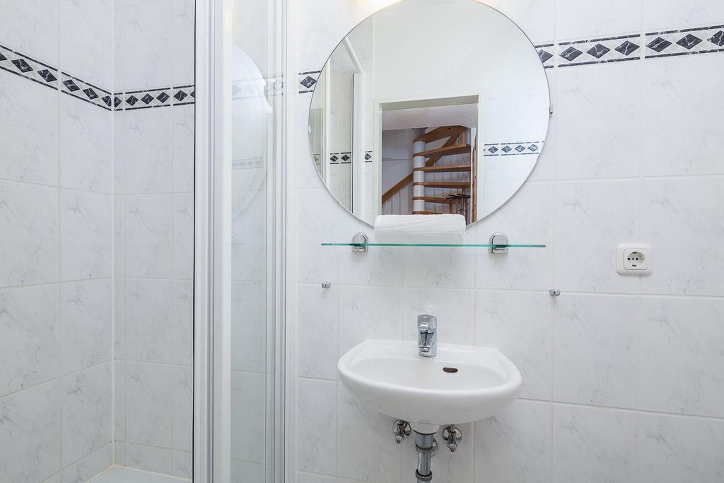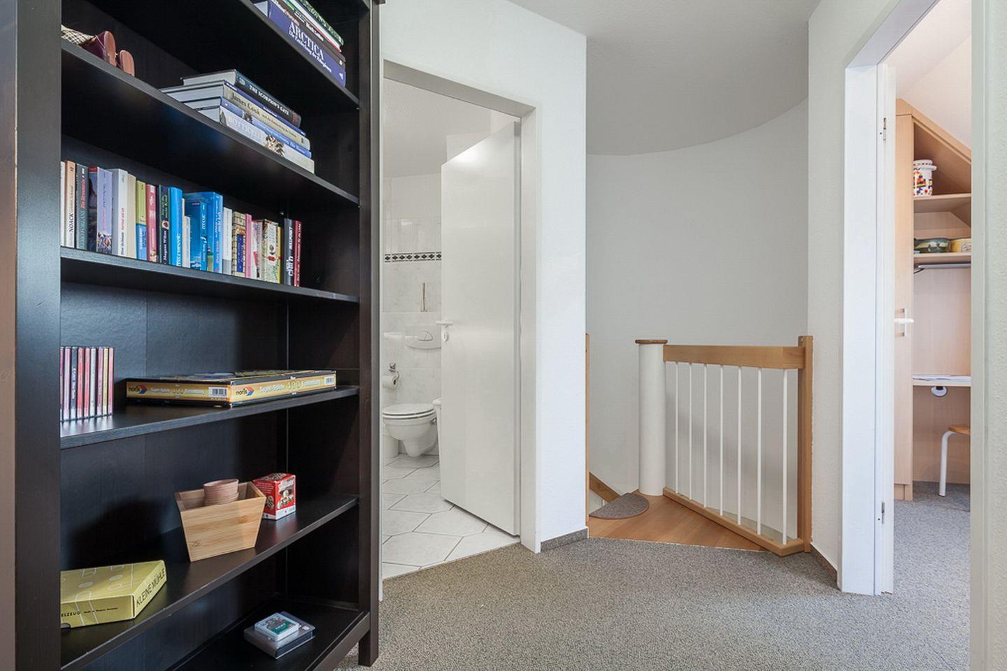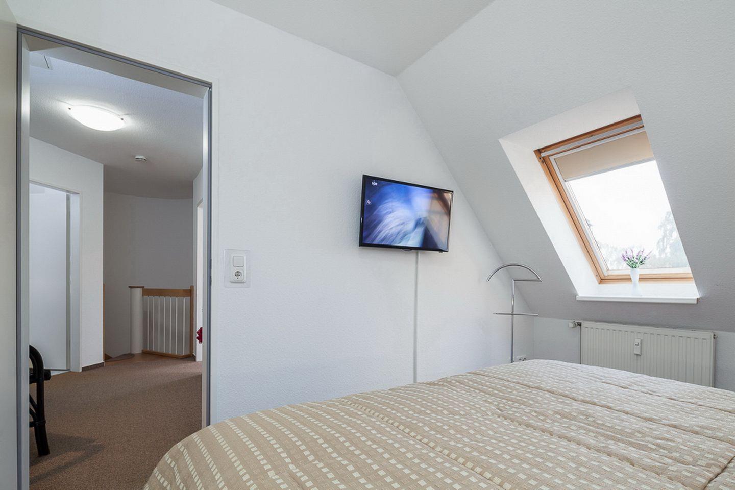 Die obere Ebene erreichst du über eine Wendeltreppe. Hier befinden sich zwei Schlafzimmer, die mit Teppichboden ausgelegt sind. Im ersten Schlafzimmer verspricht ein Doppelbett (2 x 90 x 200 cm) erholsamen Schlaf. Ein großzügiger Kleiderschrank bietet viel Platz für deine Urlaubsgarderobe. Ein zweiter Flachbildfernseher ist hier ebenfalls vorhanden. Das zweite Schlafzimmer verfügt über ein Bett (140 x 200 cm) und zusätzlich über ein Kinderreisebett und einen Schrank mit integriertem Schreibtisch. Auch hier findest du einen Flachbildfernseher. Zur Unterhaltung stehen dir diverse CDs, DVDs, Gesellschaftsspiele und einige Spiele für die Kleinsten zur Verfügung. Zwei geflieste Bäder, eins im oberen und eins im unteren Bereich, können von dir genutzt werden.