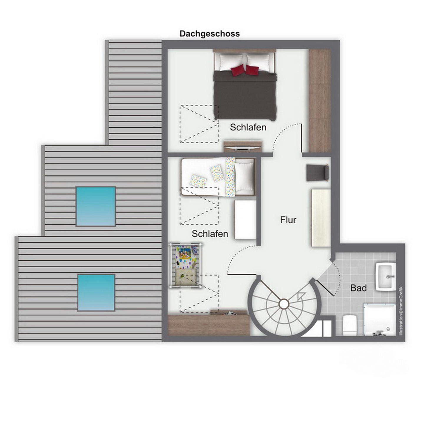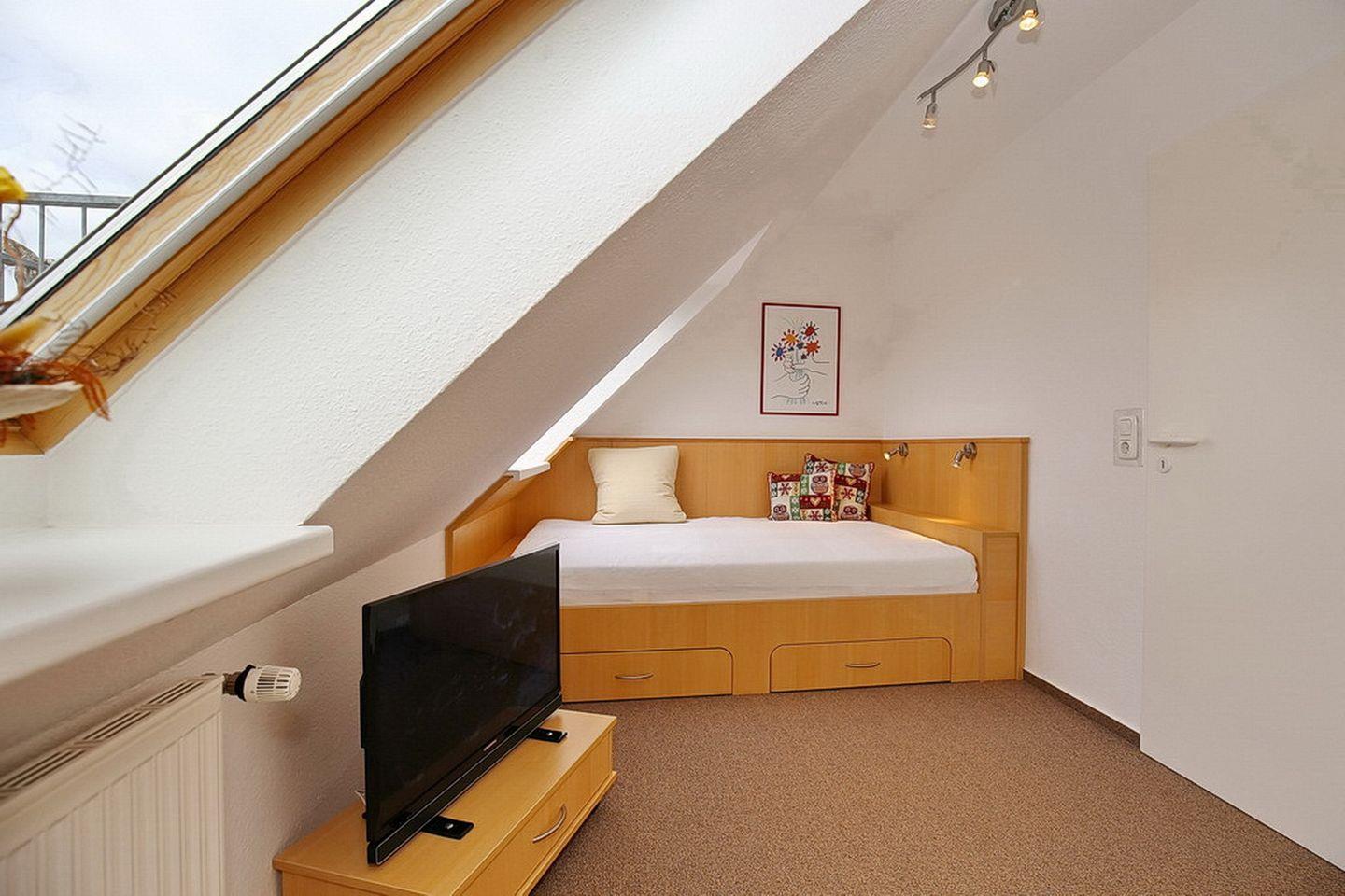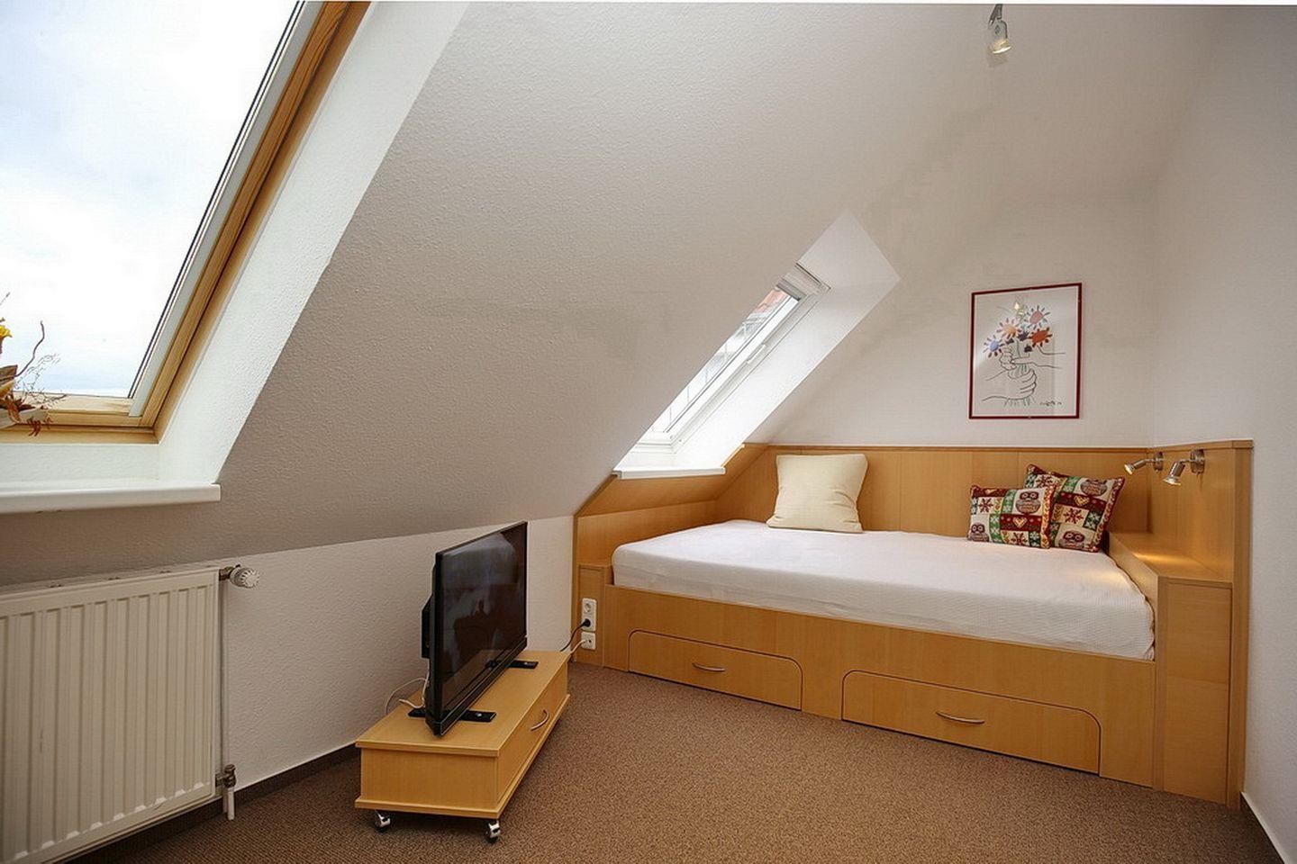 Die obere Ebene erreichst du über eine Wendeltreppe. Hier befinden sich zwei Schlafzimmer, die mit Teppichboden ausgelegt sind. Im ersten Schlafzimmer verspricht ein Doppelbett (2 x 90 x 200 cm) erholsamen Schlaf. Ein großzügiger Kleiderschrank bietet viel Platz für deine Urlaubsgarderobe. Ein zweiter Flachbildfernseher ist hier ebenfalls vorhanden. Das zweite Schlafzimmer verfügt über ein Bett (140 x 200 cm) und zusätzlich über ein Kinderreisebett und einen Schrank mit integriertem Schreibtisch. Auch hier findest du einen Flachbildfernseher. Zur Unterhaltung stehen dir diverse CDs, DVDs, Gesellschaftsspiele und einige Spiele für die Kleinsten zur Verfügung. Zwei geflieste Bäder, eins im oberen und eins im unteren Bereich, können von dir genutzt werden.