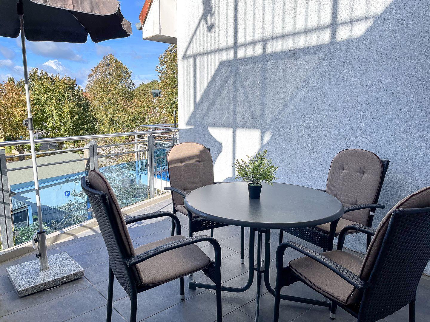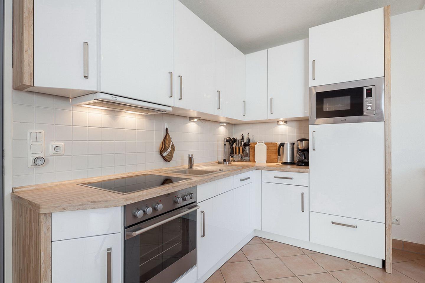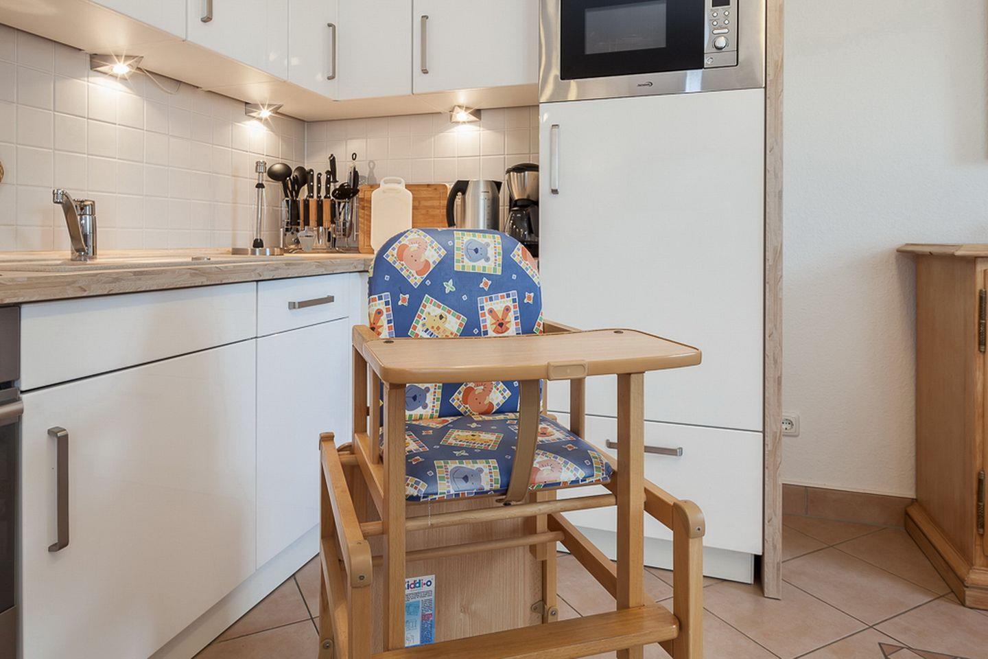 In der gefliesten Küchenzeile stehen dir ein Geschirrspüler, ein 4-Platten-Cerankochfeld mit Backofen, eine Mikrowelle, ein Kühlschrank mit Tiefkühlfach und vieles mehr zur Verfügung. Der gemütliche Essplatz befindet sich in der Nähe der Küchenzeile.