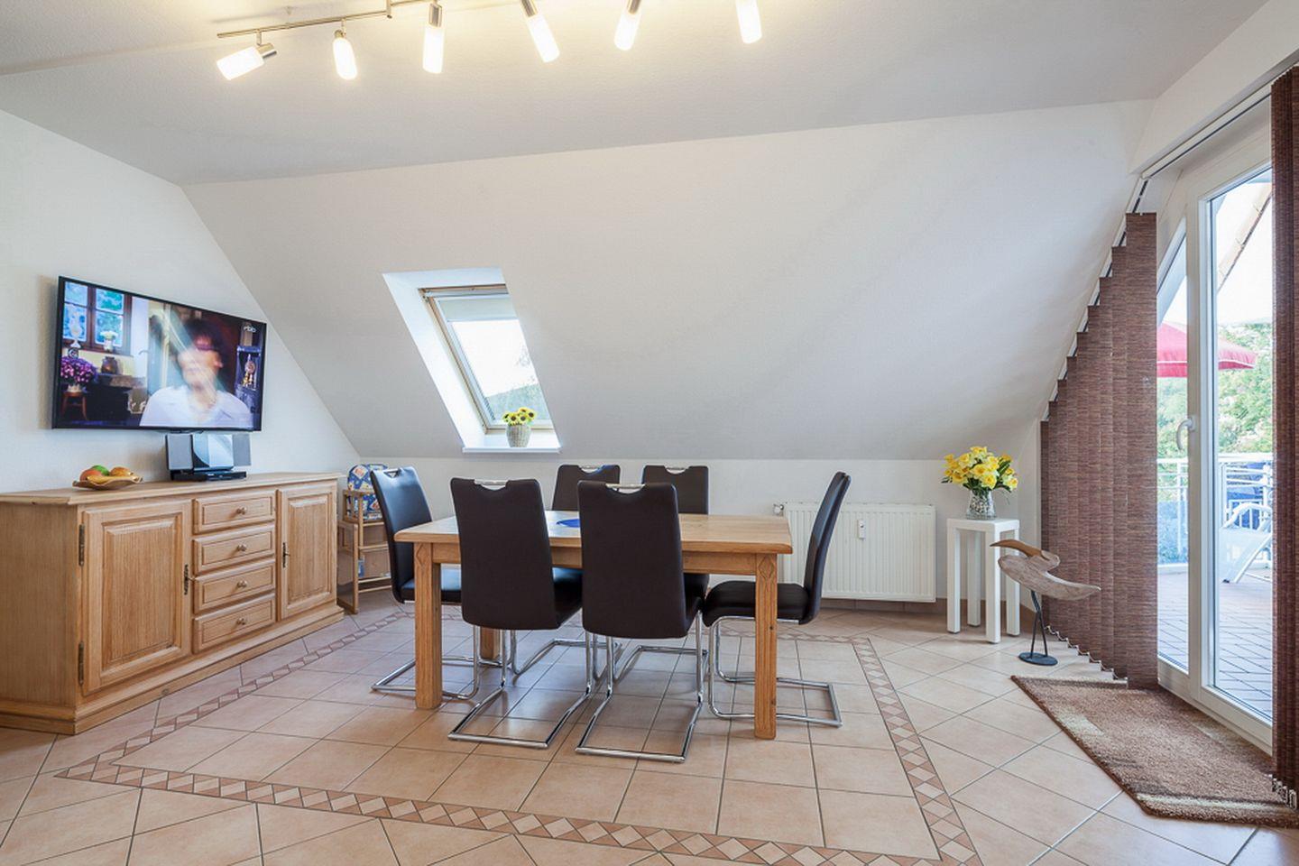 Die Ferienwohnung ist hochwertig ausgestattet. Im unteren Bereich, der komplett gefliest ist, befindet sich das Wohnzimmer. Hier verfügst du über einen Flachbildfernseher, einen Blu-Ray/DVD-Player und eine Stereoanlage. Eine Doppelschlafcouch (130 x 190 cm) bietet einen komfortablen Schlafplatz. Vom Wohnbereich hast du Zugang zur möblierten Sonnenterrasse. An den Fenstern dienen Lamellenvorhänge zur Verdunkelung.