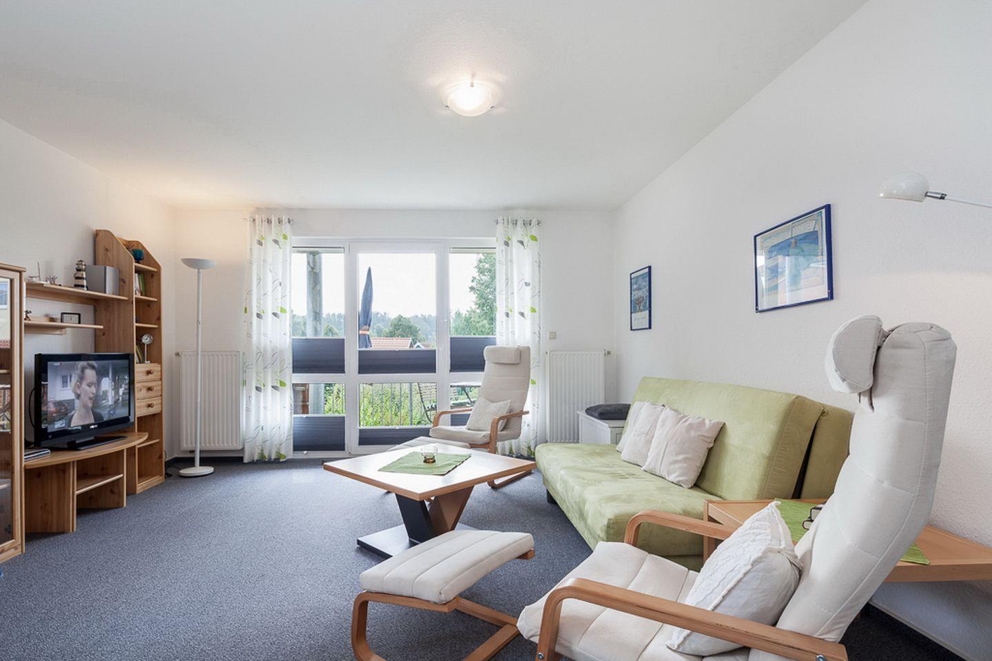 Im Wohnzimmer sorgen ein großer Flachbildfernseher sowie eine Stereoanlage für Kurzweil an Regentagen. Direkt vom Wohnzimmer gelangst du auf den Südbalkon, der einen wunderschönen Blick in die reizvolle Landschaft ermöglicht. Hier lädt ein Strandkorb zum Relaxen ein.