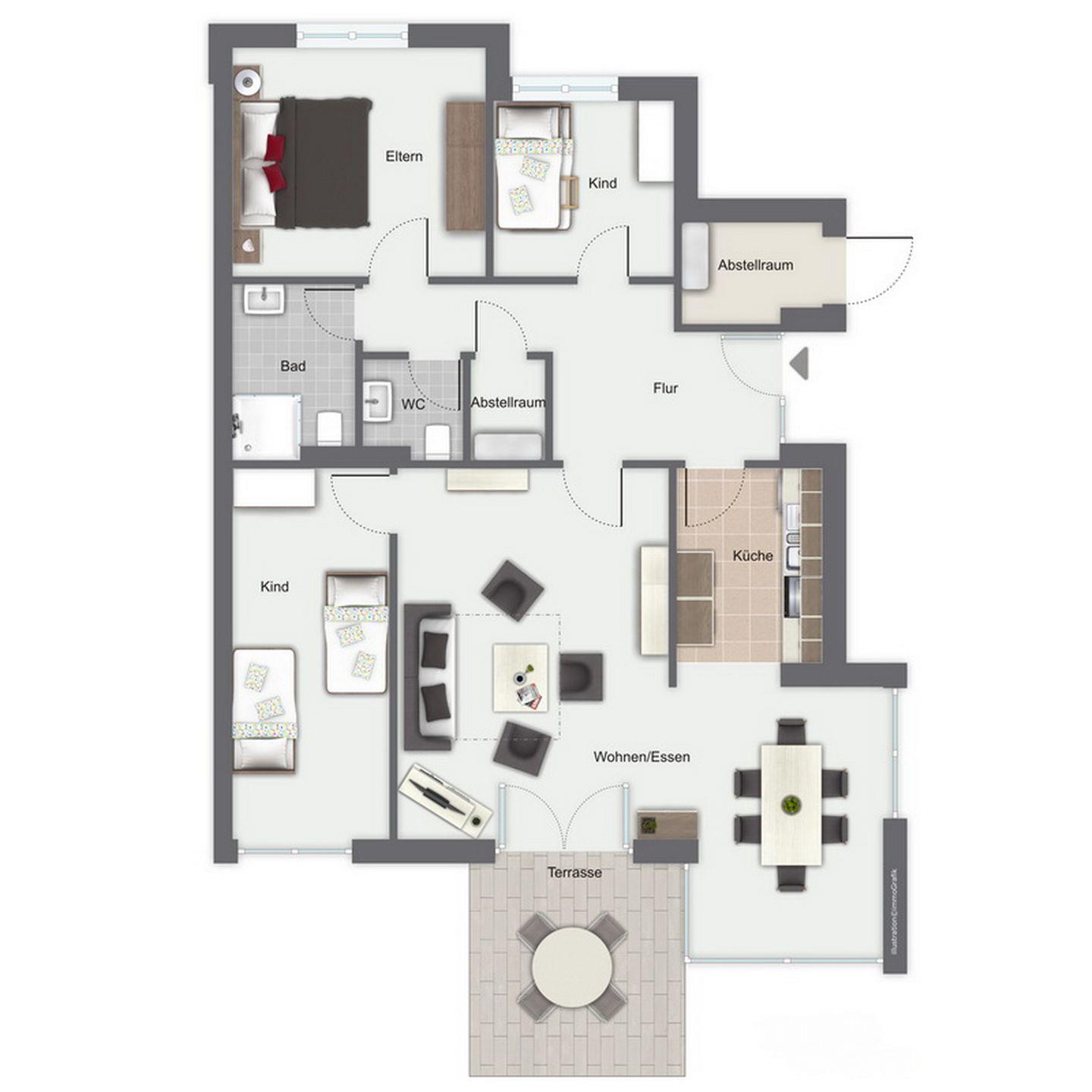 Das ca. 91 m² große Appartement Nr. 131 (EG) verfügt über 4 freundlich eingerichtete Zimmer. Deine schöne Terrasse Richtung Süd-Ost, vom Wohnzimmer aus zu erreichen, lädt zum Sonnenbaden ein. Zusätzlich gehört zur Wohnung ein kleines Grundstück.